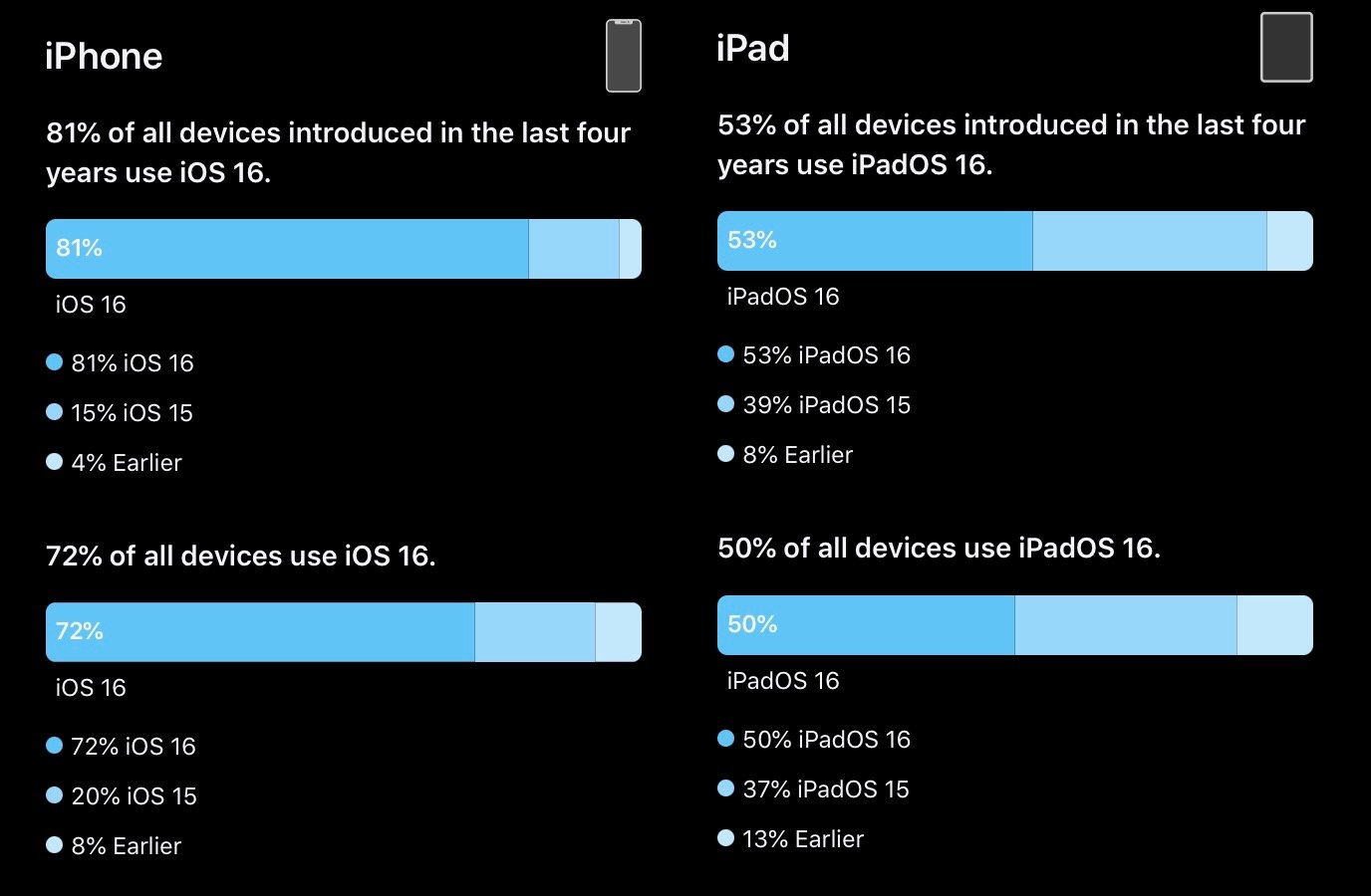 Owszem nowości nie było zbyt wiele, ale najwidoczniej to wystarczyło, aby zachęcić użytkowników do zainstalowania aktualizacji. Z danych udostępnionych przez Apple wynika, że iOS 16 trafił na 81% urządzeń z iOS, które zostały wprowadzone w ciągu ostatnich czterech lat. Tutaj udziały iOS 15 wynoszą 15%, a jeszcze starsze wersje to skromne 4%. Zdecydowanie firma Tima Cooka nie ma powodów do wstydu.