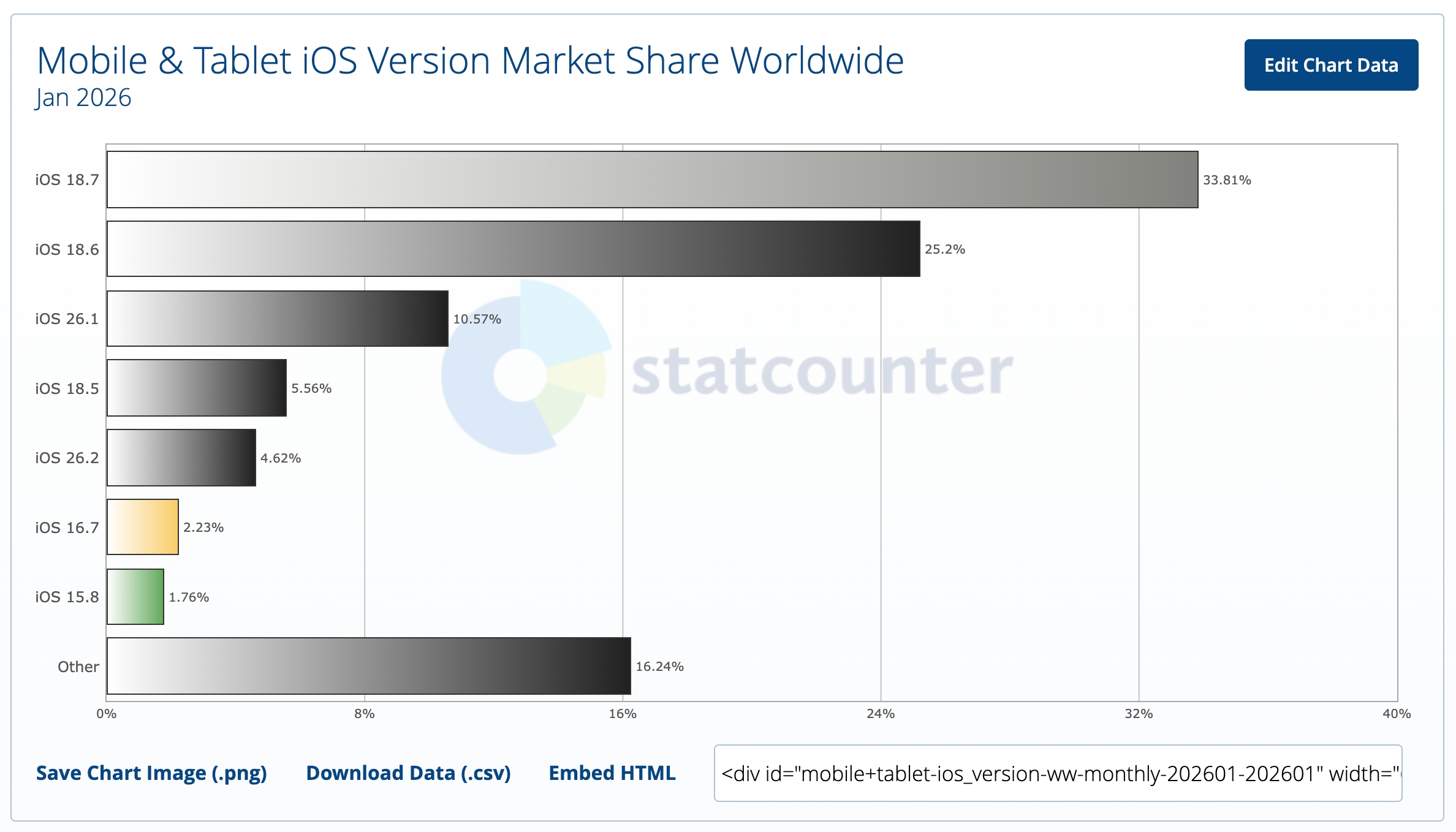 Z danych opublikowanych przez StatCounter dowiemy się, że na początku tego roku iOS 26 zainstalowany był na zaledwie około 16% urządzeń. Przy czym iOS 26.0 stanowił 1,1%, iOS 26.1 wykręcił 10,6%, a iOS 26.2 zdobył 4,6%. Natomiast ponad 60% sprzętu z Cupertino, monitorowanego przez StatCounter, nadal działało pod kontrolą iOS 18 – głównie iOS 18.7 i 18.6.
