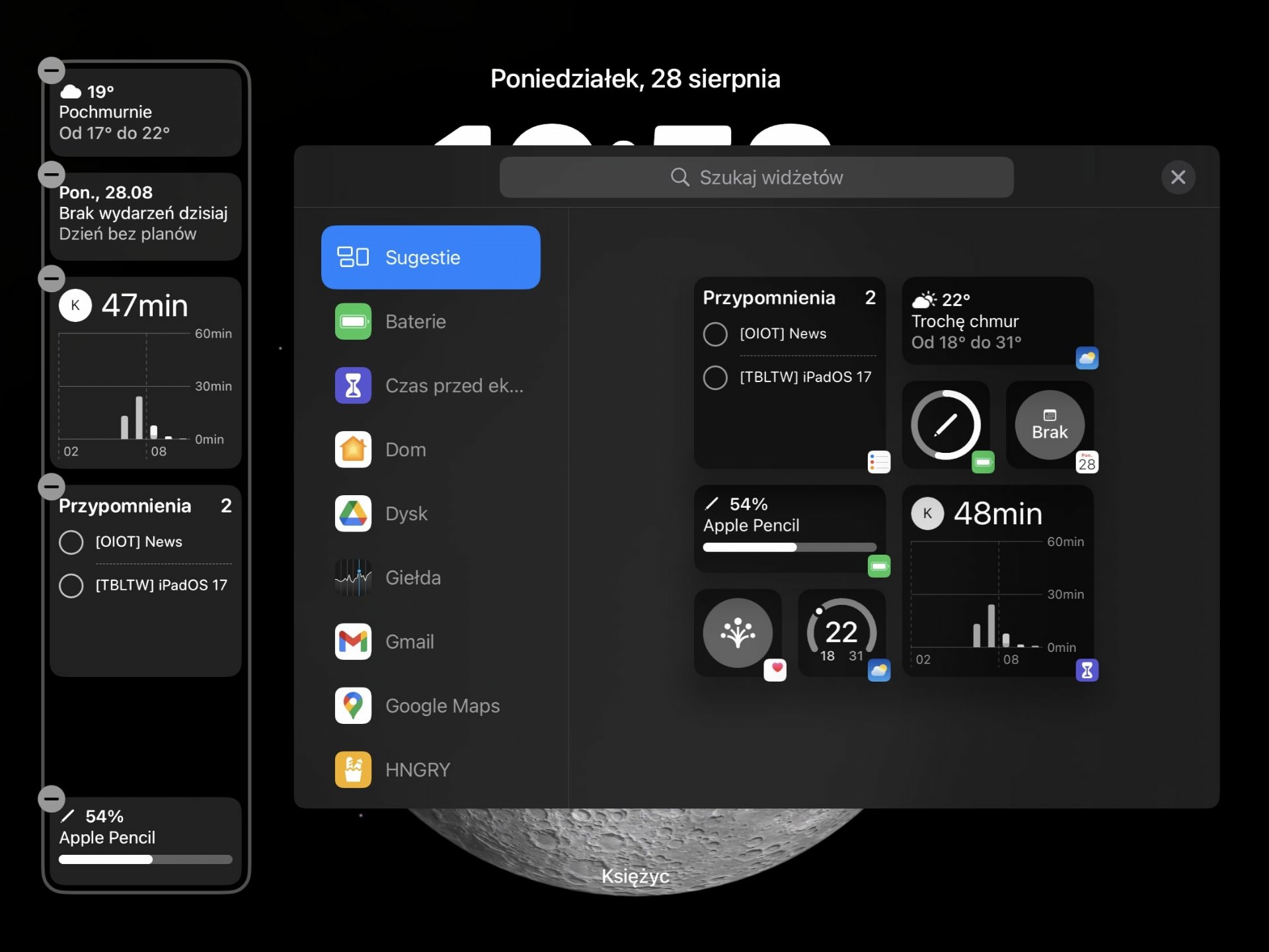 Zasada działania widżetów na tabletach Apple jest praktycznie identyczna, jak w przypadku iPhone’ów, dzięki czemu na start funkcja ta może liczyć na całkiem szeroką kompatybilność z aplikacjami od firm trzecich. Na ekranie blokady po przytrzymaniu palca w dowolnym miejscu, uruchamia się tryb edycji, w którym zmieniać możemy takie elementy, jak ogólny motyw ekranu, czcionkę i kolor zegara, jak i oczywiście same widżety.
