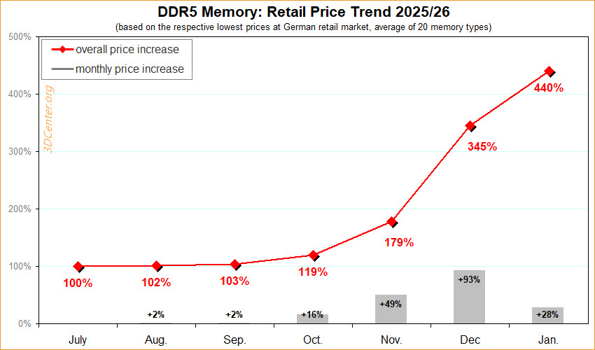 Raport 3DCenter, dotyczący niemieckiego rynku, pokazuje, że z najwyższym wzrostem cen mamy do czynienia w przypadku wielkoformatowej, to znaczy przeznaczonej do komputerów osobistych, pamięci DDR5. Moduły tego typu w styczniu 2026 roku są droższe średnio o 27,6% niż miesiąc wcześniej i ponad czterokrotnie droższe niż pół roku temu (konkretnie: w lipcu 2025 roku). Dynamika wzrostu zmalała w ostatnim miesiącu, ale wcale nie wygląda to optymistycznie.