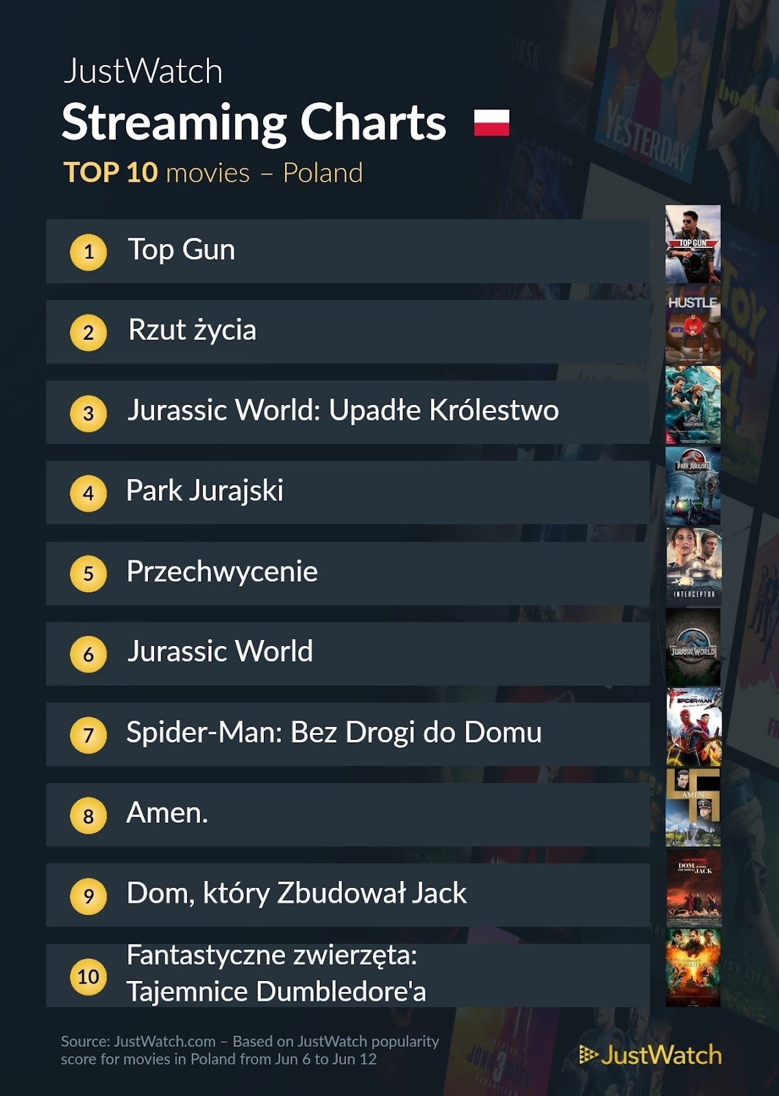 W pierwszej szóstce widać też silną obecność filmów z serii Jurassic World. Ma to związek z premierą Jurassic World Dominion, które w polskich kinach można oglądać już od kilku dni. Najwyraźniej część z nas postanowiła jeszcze raz obejrzeć dwie dotychczasowe odsłony, by łatwiej wgryźć się (hehe) w akcję najnowszej i jednocześnie ostatniej odsłony tego cyklu.