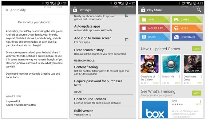 Na pierwszy rzut oka market wiele się nie zmienił. Jednak prawdziwą odmianę dostrzeżemy przechodząc na stronę jednego z produktów dostępnych w Google Play. Tutaj praktycznie wszystko jest nowe.  Zamiast logo aplikacji, które dotychczas obecne było w lewym, górnym rogu, znajdziemy sporej wielkości okno z wideo prezentującym dany produkt. Przyciski „zainstaluj” oraz „otwórz” również zmieniły swoje położenie oraz wielkość. Teraz są znacznie większe, utrzymane w tonie Material Design i położone w poziomie. Ponadto zmieniona została strona z opisem aplikacji. Obecnie wyświetlany jest on w trybie pełnoekranowym.
