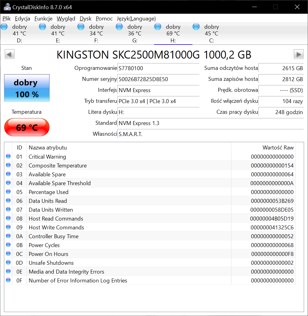 Na zakończenie kilka słów o temperaturze. Maksymalna temperatura robocza ustalona przez Kingstona wynosi 70° C. Testy termiczne wykonałem w jeden z najbardziej upalnych dni lata i mimo obciążenia dysku temperatura nie przekroczyła 69° C.