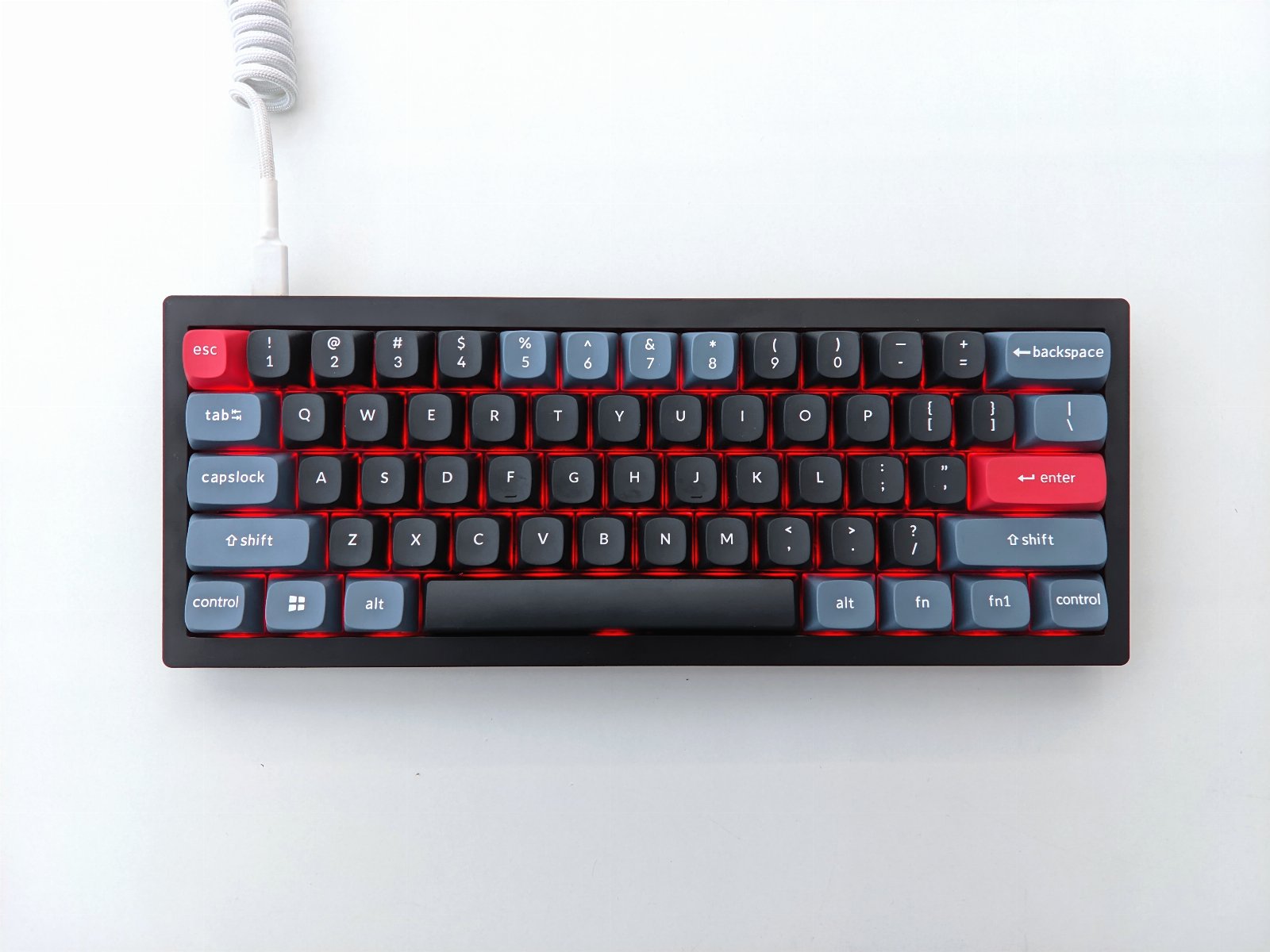 Kolory użytych w Keychron V4 nakładek są nietypowe, gdyż nie wszystkie z nich są czarne. Producent zdecydował się na zastosowanie szarego w przypadku modyfikatorów oraz cyfr od 5 do 8, czarnego do literek, pozostałych cyferek i spacji, a także czerwonego jako akcentów w miejscu Esc i Enter. Jest to o tyle nietypowe, że na ogół widuje się literki w jaśniejszym kolorze, a modyfikatory w ciemniejszym. Tu jest jednak na odwrót. Ponadto muszę zwrócić uwagę, że klawisz \| jest szary, mimo że nie jest modyfikatorem. Nie podoba mi się też, że niektóre cyferki są szare. Bardziej estetycznie byłoby pozostawić je w kolorze czarnym. Pomijając jednak te drobne „wady”, podoba mi się takie połączenie barw, gdyż pasują one perfekcyjnie do czarnej klawiatury.