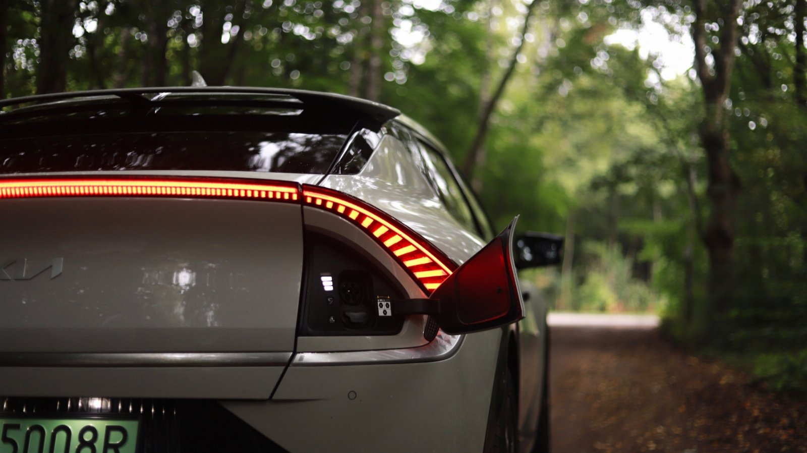 Przejdźmy jednak wreszcie do zewnętrznego designu. Uważam, że Kia EV6 jest jednym z ciekawej zaprojektowanych elektryków na rynku i niektóre elementy potwierdzają, że projektanci nie bali się wprowadzać odważniejszych pomysłów. Dobrym przykładem jest tylne światło, ciągnące się od lewej do prawej krawędzi i mające formę kojarzącą się z łęczyskiem w łuku. Wygląda to naprawdę atrakcyjnie, aczkolwiek obawiam się o ewentualny koszt naprawy/wymiany.