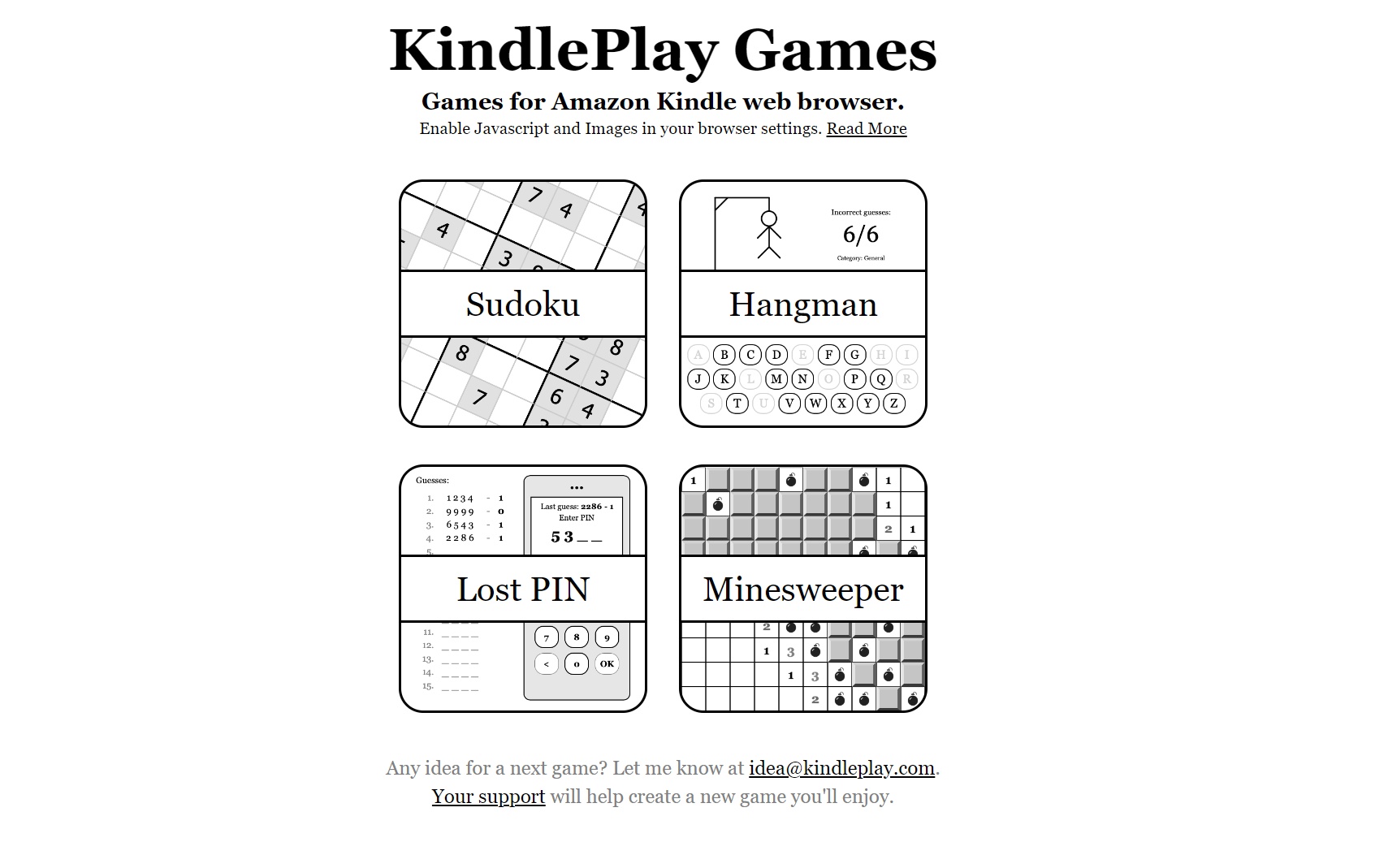 Kwestię wymagań sprzętowych mamy za sobą. Druga sprawa – musicie mieć włączoną obsługę obrazków i JavaScript w przeglądarce. Jeżeli wszystko już gotowe, wystarczy że wejdziecie na stronę KindlePlay. Znajdzieice tam cztery tytuły, które nie potrzebują ani szybkich, ani kolorowych wyświetlaczy do zabawy – Sudoku, Wisielec, Saper i „zgadywanie PIN-u”.