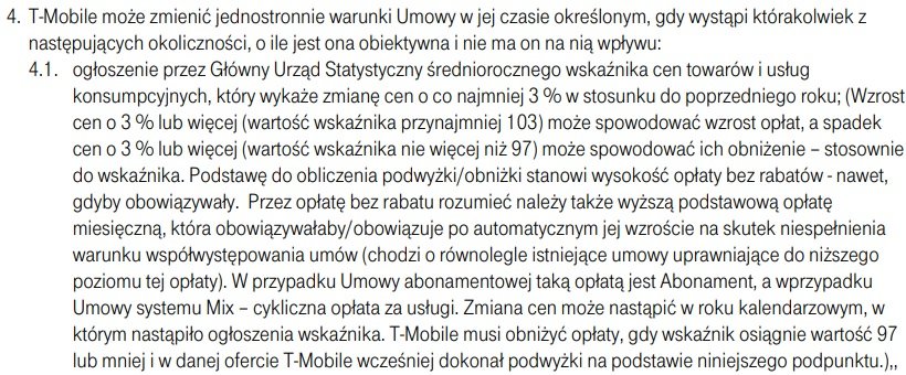 Zmiana ceny może nastąpić w roku, w którym GUS opublikował informacje na temat średniorocznego wskaźnika cen towarów i usług konsumpcyjnych, co oznacza, że T-Mobile może je zmienić tylko jeden raz w roku kalendarzowym. Ponadto w przypadku, gdy wskaźnik osiągnie wartość 97 lub mniejszą (tj. nastąpi spadek cen rok do roku, czyli deflacja), operator zobowiązuje się do obniżenia cen w ofertach, w których wcześniej je podniósł.