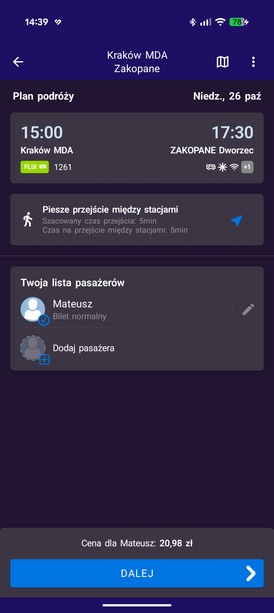 Bilety na autobusy FlixBus dostępne są już w aplikacji w tym samym miejscu, co bilety na pociąg. Wystarczy wpisać miejsce, z którego zamierzamy ruszyć i punkt docelowy, a następnie z listy wybieramy interesujące nas połączenie. Na koniec pozostaje kupić bilet, wybierając jedną z obsługiwanych metod płatności.
