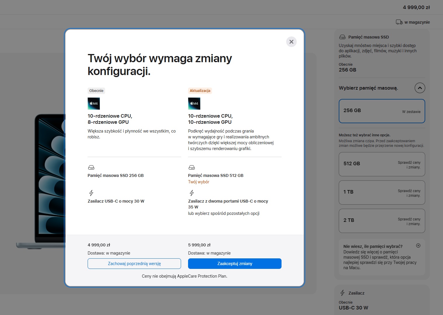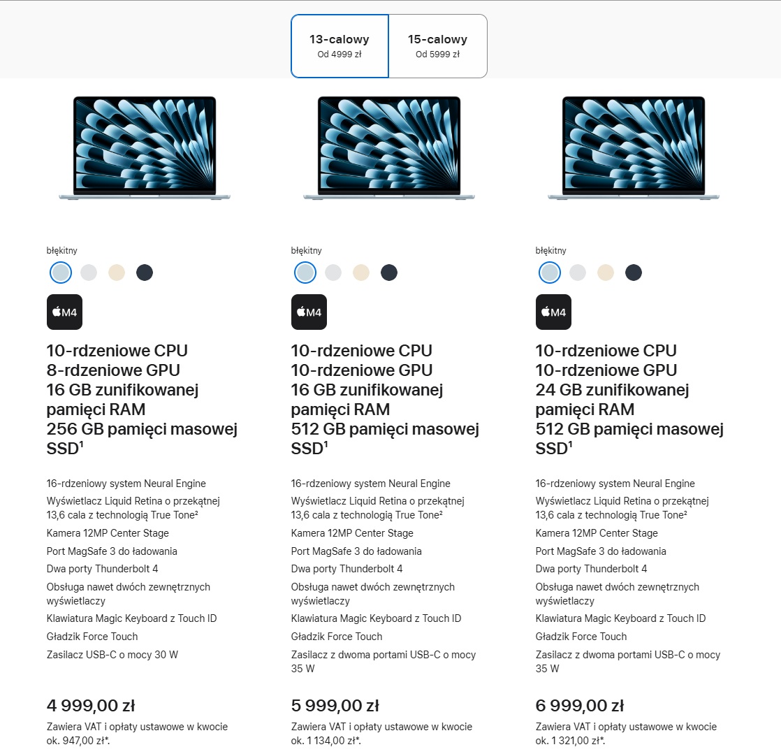 Naturalnie lista dostępnych opcji różni się w zależności od komputera. Na przykład w przypadku MacBooka Air z Apple M4 najpierw trzeba wybrać przekątną ekranu, później kolor i w końcu procesor. Następnie sklep automatycznie uzupełnia ilość pamięci RAM i masowej oraz zasilacz i klawiaturę.