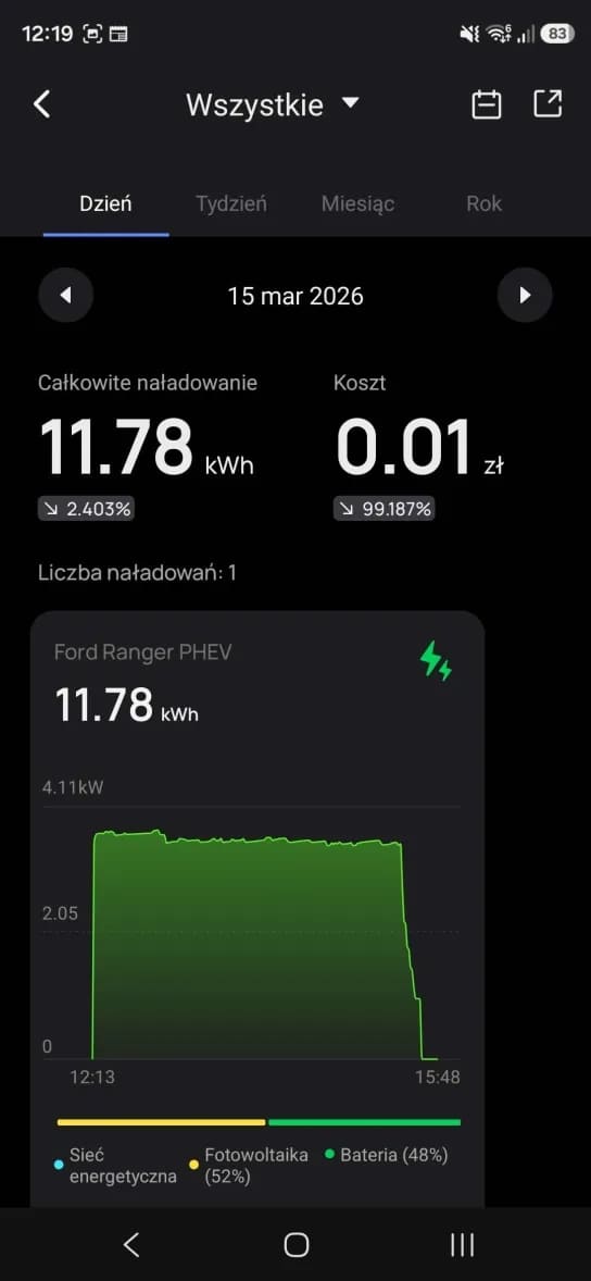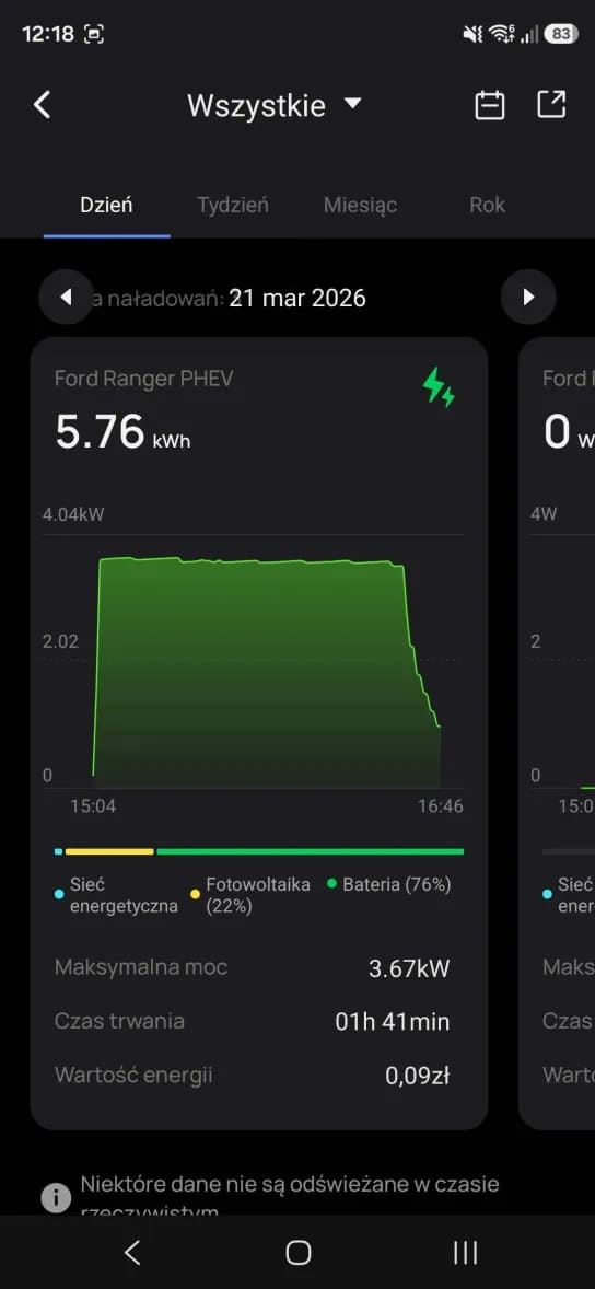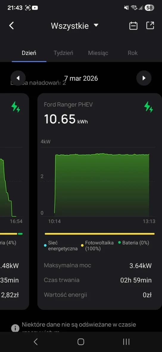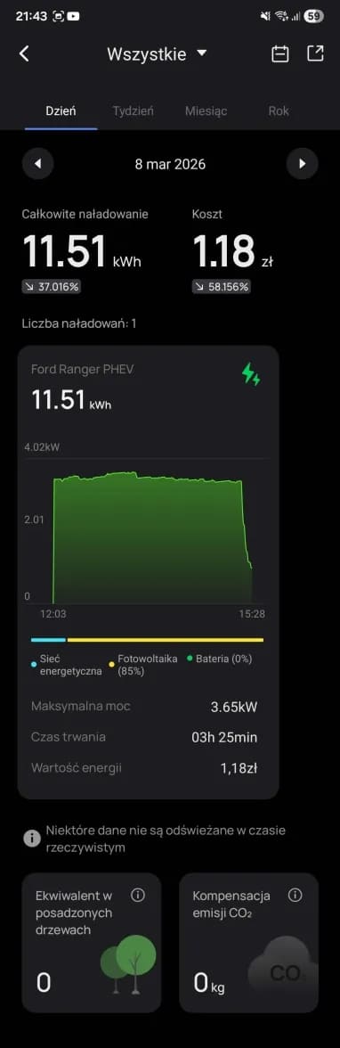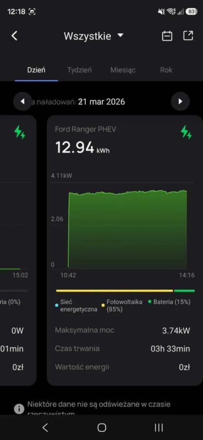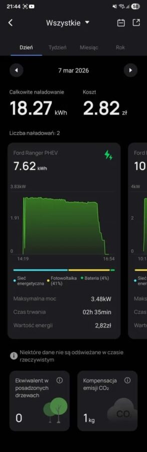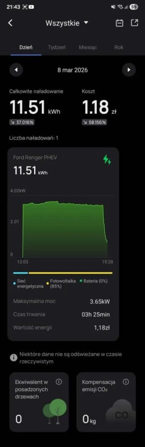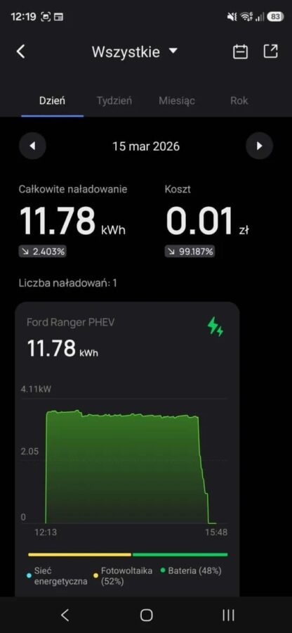 A gdy już wyszło słońce… Ranger ładuje się za darmo z bieżącej nadprodukcji prądu przez panele fotowoltaiczne, bo największą frajdę daje jednak tryb “Solar Only”. To moment, w którym patrzysz na licznik i widzisz, że Twój samochód tankuje się… fotonami. Dosłownie.