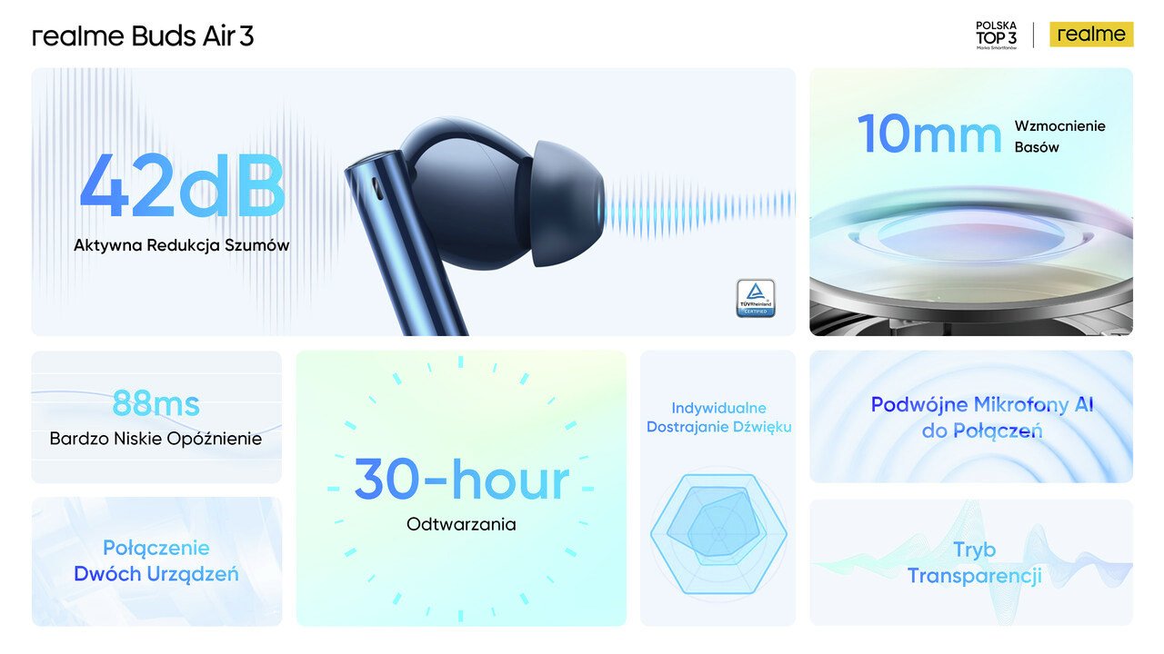 Producent zaimplementował tu 10-mm przetworniki, baterię o pojemności 546 mAh zapewniającą do 30 godzin odtwarzania, a także certyfikat IPX5 (ochrona przed zachlapaniami). Do dyspozycji użytkownika będą trzy tryby pracy – transparentny, ANC, a także niskiego opóźnienia 88 ms. realme Buds Air 3 zostały wycenione w Polsce na 279 złotych.