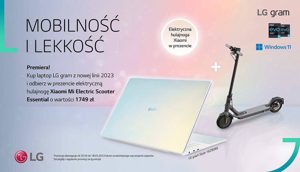 Z okazji premiery ultrabooków z serii gram na 2023 rok, LG ma dla Was arcyciekawą promocję. Jeżeli do 18 maja 2023 roku kupicie jeden z najnowszych laptopów oraz zarejestrujecie zakup na dedykowanej stronie poświęconej akcji, możecie otrzymać elektryczną hulajnogę Xiaomi Mi Electric Scooter Essential, której wartość wynosi 1749 złotych.