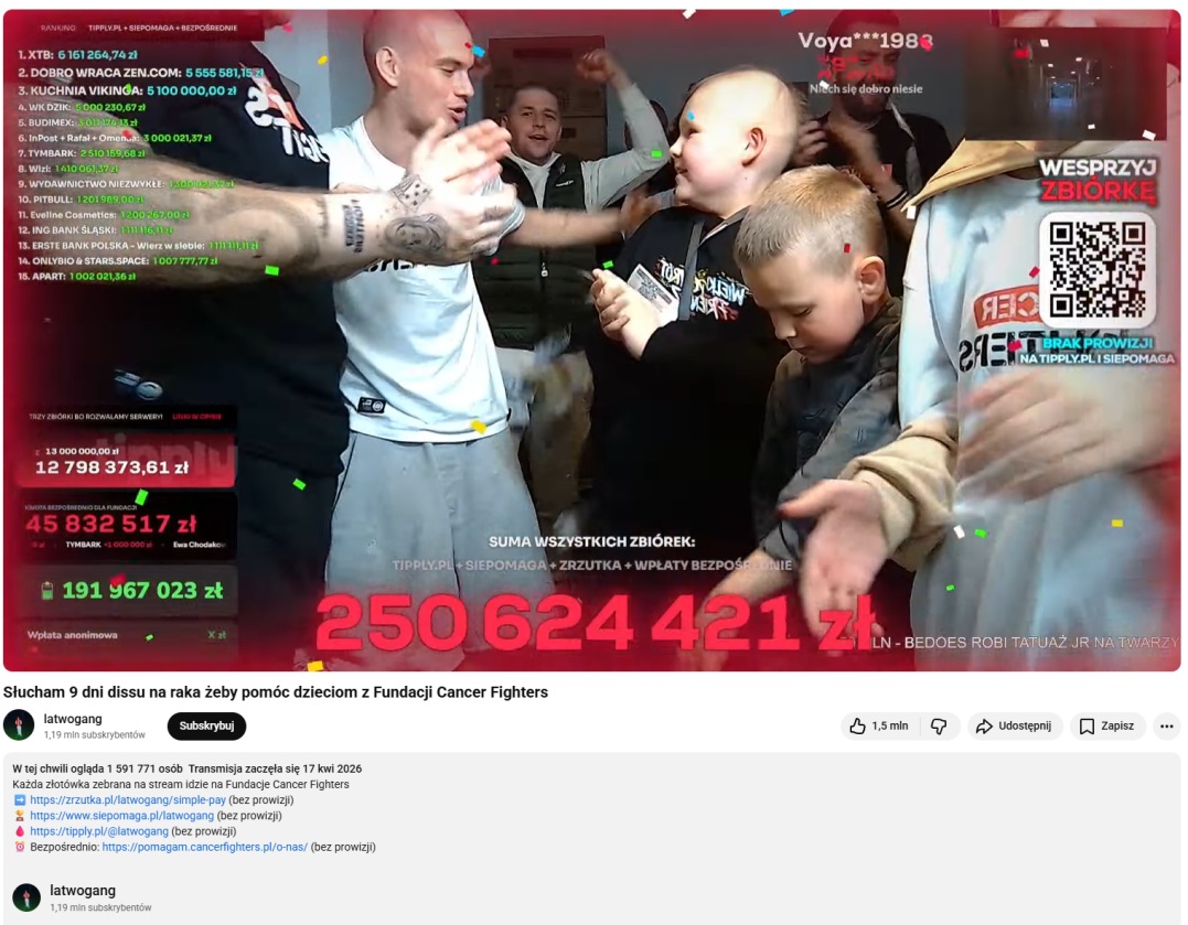 Choć wszyscy skupiają się na wysokości zebranej kwoty, warto też odnotować, że również sam Łatwogang dużo zyskał na tej akcji. Jak podaje Social Blade, jeszcze 17 kwietnia 2026 roku, czyli w dniu rozpoczęcia transmisji, miał ~420 tysięcy subskrypcji. Dziś ma natomiast już 1,25 miliona subskrybentów.