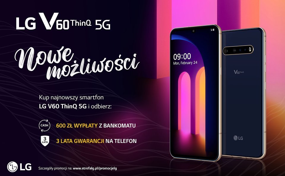 Z kolei osoby, które do 17 lipca 2020 roku kupią w Play flagowy model LG V60 ThinQ 5G, po rejestracji na dedykowanej stronie internetowej, otrzymają w prezencie dodatkowy (trzeci) rok gwarancji na smartfon, a także możliwość odebrania aż 600 złotych w gotówce z bankomatu.