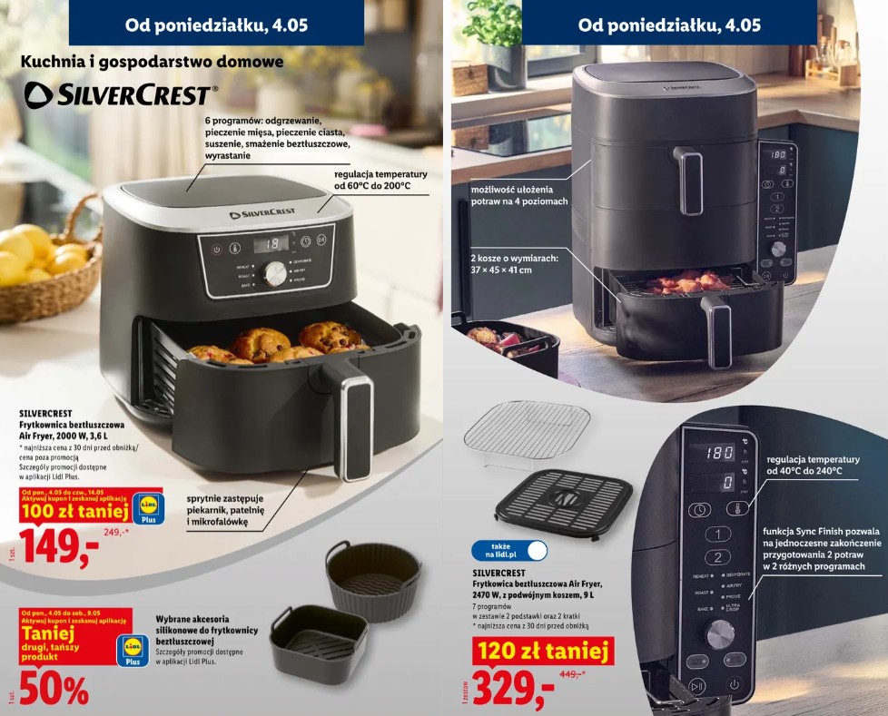 Nie tylko Lidlomix będzie oferowany w niższej cenie. Promocją zostaną objęte również frytkownice beztłuszczowe. Jedna z nich to Silvercrest Air Fryer 2470 W z podwójnym (piętrowym) koszem oferująca pojemność 9 litrów. Cena za ten model wyniesie 329 złotych (zamiast 449 złotych). Z kolei model Air Fryer 2000 W z pojedynczym koszem o pojemności 3,6 litra sprzedawany będzie za 149 złotych (zamiast 249 złotych).