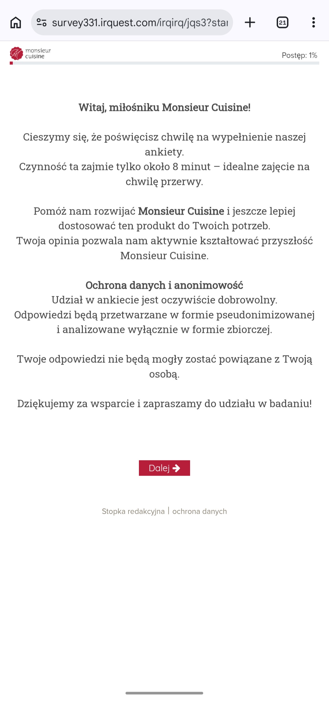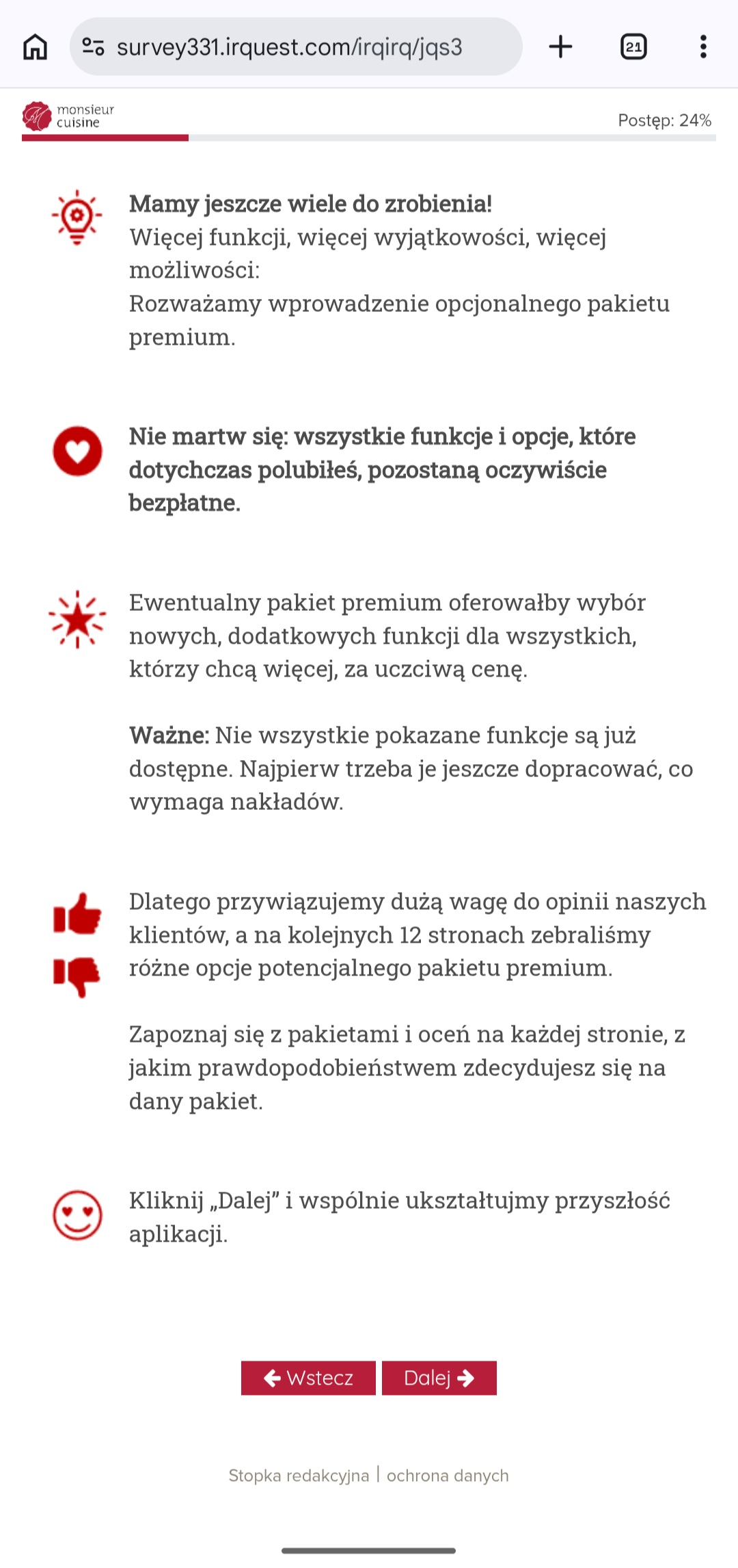 Dotychczas aplikacja i cały ekosystem Lidlomiksów był w pełni darmowy, jednak najnowsza ankieta może sugerować, że w przyszłości niemiecki producent zmieni podejście, choć nie do końca. Jeśli otworzysz aplikację Monsieur Cuisine, najprawdopodobniej zobaczysz okno zachęcające do udziału w dobrowolnej, anonimowej ankiecie.