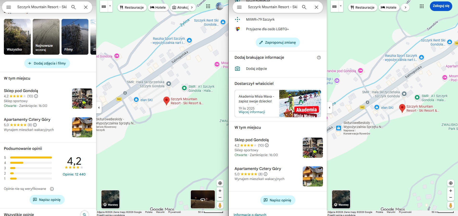 To jednak nie koniec. Prawdopodobnie największym problemem dla osób niezalogowanych jest ograniczenie informacji dotyczących konkretnych obiektów np. ośrodków narciarskich, restauracji czy hoteli. Osoby niezalogowane do konta Google nie zobaczą m.in. cen, zdjęć i filmów udostępnionych przez klientów, najczęściej wybieranych godzin odwiedzin (sekcji o nazwie Popularne godziny), a nawet opinii publikowanych przez osoby, które już odwiedziły dany obiekt.