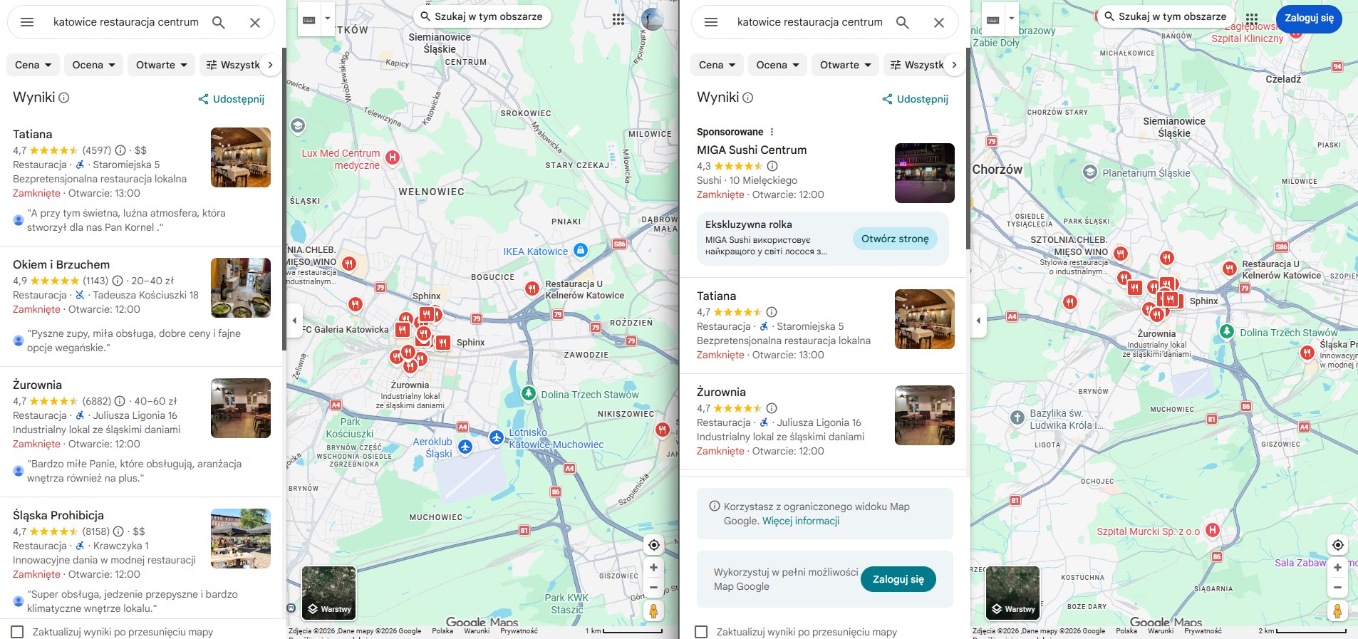 Jeśli np. szukasz miejsca na romantyczną kolację w centrum Katowic – bez zalogowania nie zobaczysz wszystkich wartych uwagi restauracji. Na liście znajdą się wyłącznie sponsorowane obiekty, czyli te, za których reklamę wniesiono opłatę. Poza tym na dole listy wyników zobaczysz też wcześniej wspomniany komunikat Korzystasz z ograniczonego widoku Map Google.