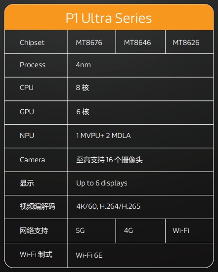 Procesor MediaTek Dimensity P1 Ultra oferuje także obsługę łączności Bluetooth, dwupasmowego Wi-Fi 6E i globalnych systemów satelitarnych oraz do 16 kamer i do 6 wyświetlaczy (z opcją jednoczesnego wyświetlania jednego obrazu na wszystkich). Do tego zapewnia także wsparcie dla kodeków H.264/H.265, jak również odtwarzania i nagrywania wideo w rozdzielczości do 4K w 60 klatkach na sekundę. Na pokładzie jest też „flagowy procesor obrazu HDR ISP”, obsługujący redukcję szumów AI, AI 3A i inne inteligentne technologie optymalizacji obrazu.