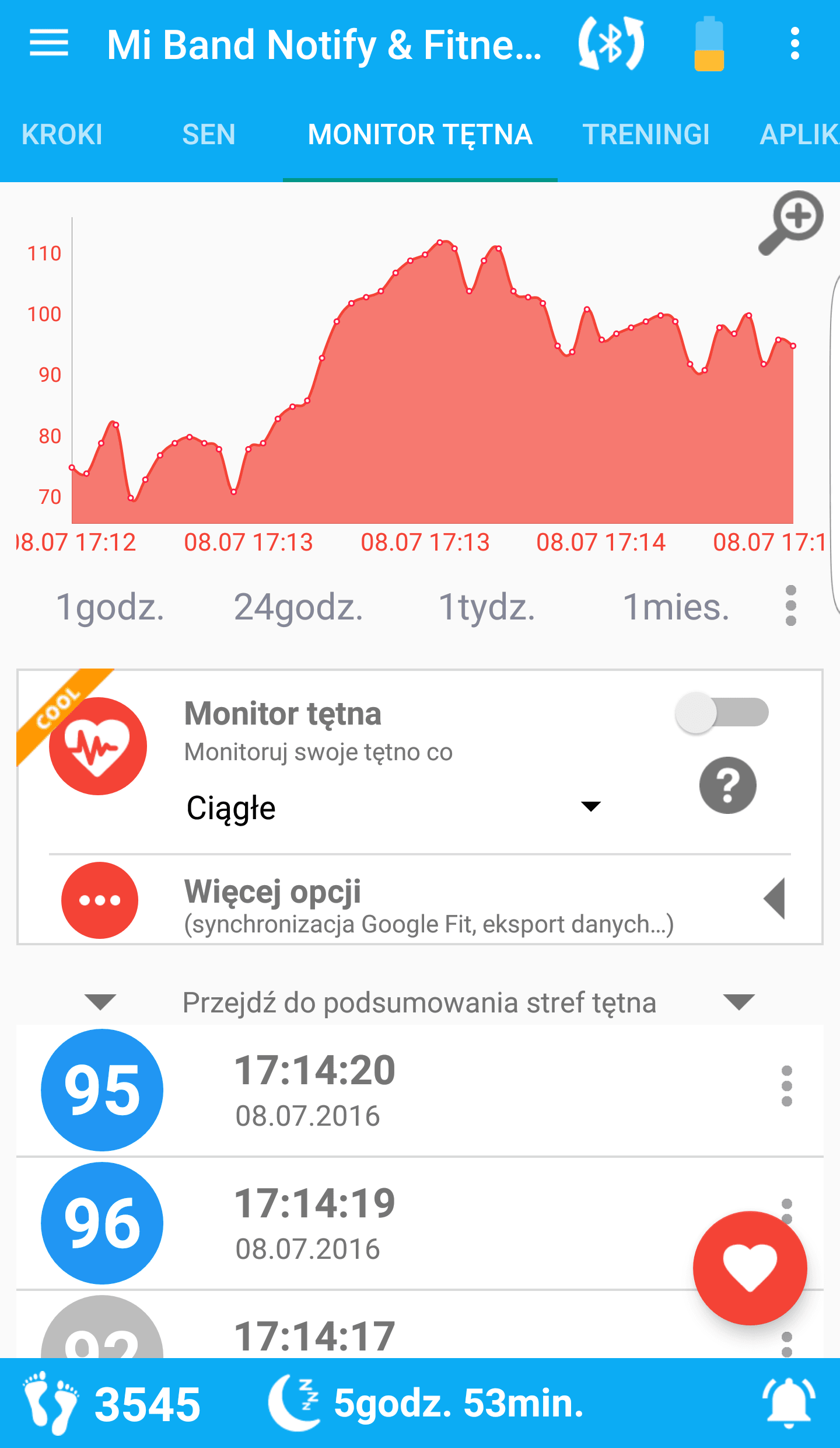 Na szczęście Mi Band Notify & Fitness pozwala nam na uruchomienie pomiaru pulsu w trybie ciągłym, co natychmiastowo wykrywa Endomondo. W tym momencie Mi Band 2 nie tylko jest w stanie odpowiednio zaalarmować nas o powiadomieniu, ale w istotny sposób wesprzeć pomiary przy treningu. Oczywiście sama w sobie również jest w stanie rejestrować aktywność. Dodatkowo posiada informacje na temat przebytych kroków oraz analizę snu.