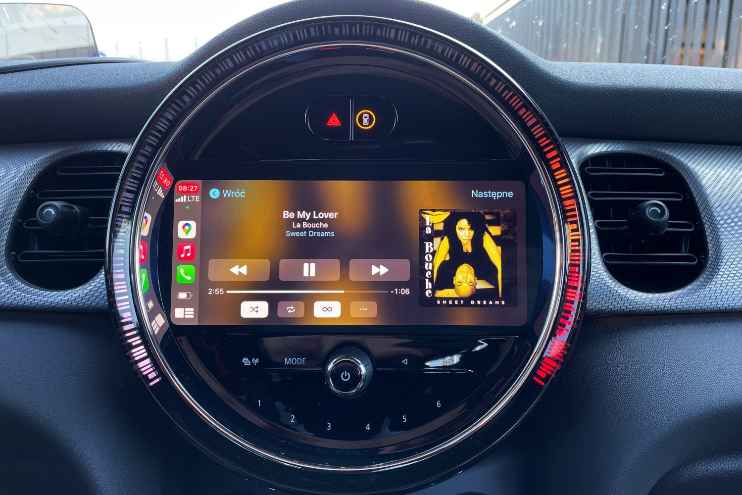 Skoro już jesteśmy przy przyciskach, to jest ich całkiem dużo. Zapewniają one dostęp do najważniejszych funkcji, bez konieczności sięgania do dotykowego wyświetlacza. Sterowanie klimatyzacją, dźwiękiem, wybieranie trybów jazdy czy poruszanie się po interfejsie systemu realizowane jest za pomocą fizycznych przycisków. Brawo MINI!
