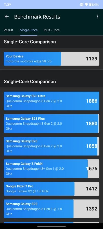 Qualcomm Snapdragon 7 Gen 3, 12 GB LPDDR4X, 512 GB UFS 2.2, Android 14 – takie połączenie odpowiada za działanie Motoroli Edge 50 Pro. W smartfonie za trzy tysiące złotych chciałoby się ósemkę zamiast siódemki i jednak szybszą pamięć wewnętrzną, bo to ona daje obawy o to, jak telefon będzie działał w kolejnych latach eksploatacji.