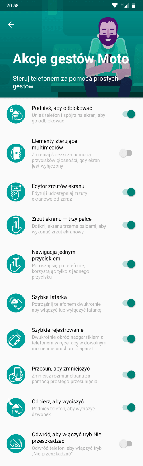 Wszelkie pozostałe funkcje dodane przez producenta znajdują się w aplikacji o nazwie „Moto” oraz, nieco bez sensu, zdublowane w ustawieniach w zakładce o tej samej nazwie. Motorola główny nacisk kładzie tu na sterowanie różnymi funkcjami telefonu za pomocą gestów oferując m.in.: dwukrotne potrząśnięcie telefonem w celu uruchomienia latarki, dwukrotne obrócenie urządzenia w celu uruchomienia aparatu czy wyciszenie dzwonka telefonu po jego podniesieniu (szczególnie przydatne w obliczu jakości dźwięku). Trzeba przyznać Motoroli, że każda dostępna tu funkcja jest przemyślana i faktycznie może się przydać, może poza gestem wykonania screenshota trzema palcami, ponieważ każda próba zrobienia zrzutu poprzez dotknięcie ekranu wywoływała niepożądaną akcję w systemie.
