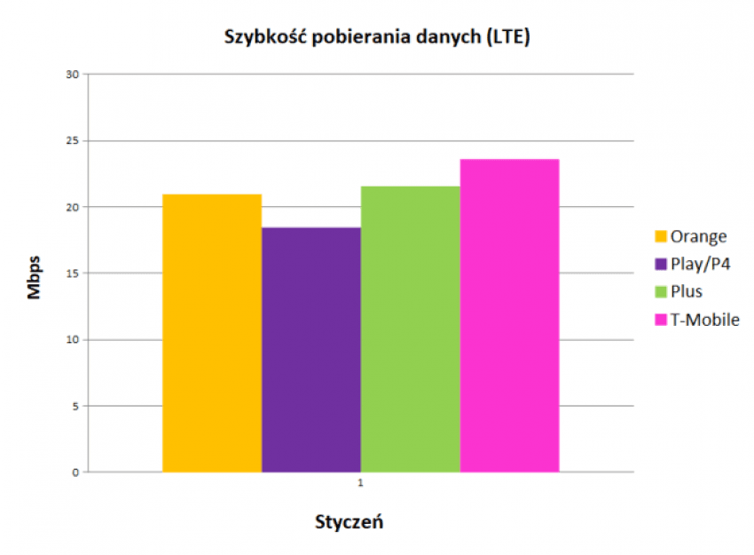 Do tej pory w takich rankingach na pierwszym miejscu często plasowało się Orange. Tym razem jednak mamy sporą roszadę. Najwyższą średnią szybkość pobierania danych w styczniu, mogła zaoferować sieć T-Mobile (23,6 Mb/s). Drugie miejsce zajął Plus z 21,56 Mb/s, zaś dotychczasowy pomarańczowy lider spadł na miejsce trzecie z wynikiem 20,95 Mb/s. Play znowu poza podium – dla Fioletowych średnia prędkość pobierania to 18,46 Mb/s.