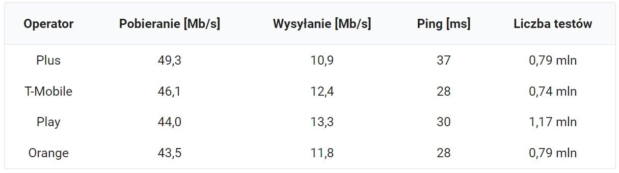 Który operator dostarczał najszybszy internet mobilny w zeszłym roku? Pewnie dla wielu z Was nie jest żadnym zaskoczeniem, że pierwsze miejsce w tym rankingu przypadło właśnie Plusowi, który mocno ruszył w 2023 roku z aktywacją swojej usługi 5G (wówczas na pasmach LTE). Niemniej jednak przyczyniło się to do jego wygranej w tym zestawieniu. Średnia prędkość pobierania wyniosła 49,3 Mb/s, wysyłania 10,9 Mb/s, a średnie opóźnienie w jego przypadku to 37 ms. Na kolejnych miejscach znalazły się: T-Mobile, Play oraz Orange. Warto jednak zaznaczyć, że różnice pomiędzy operatorami nie są duże, co możecie zobaczyć w tabeli poniżej.