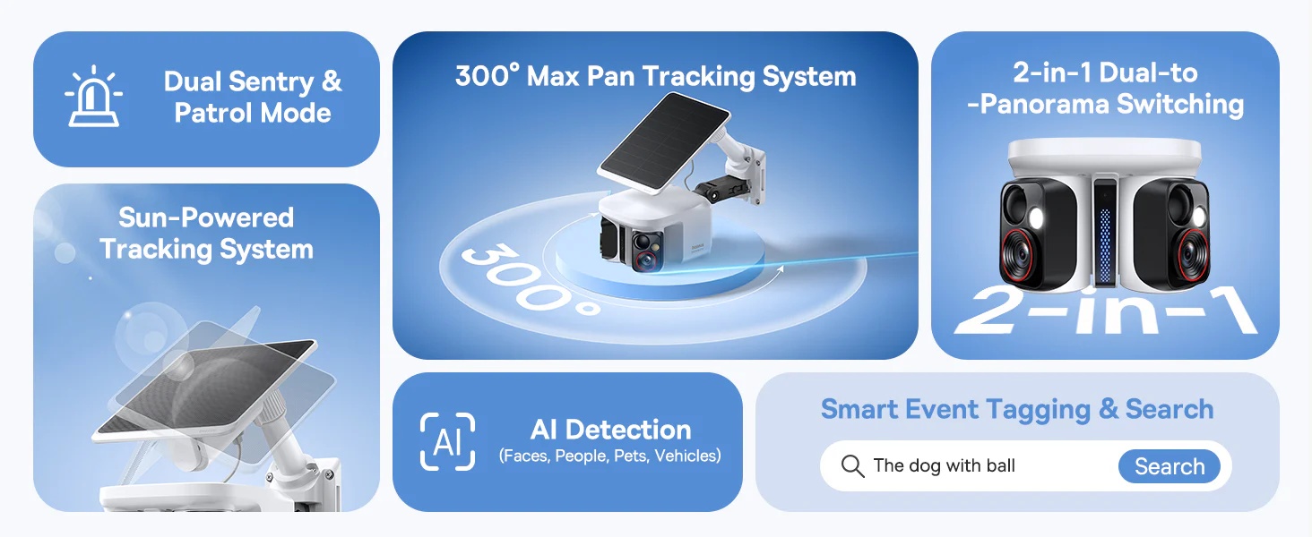 Kamera może przechowywać nagrania lokalnie dzięki obecności czytnika kart microSD o maksymalnej pojemności 512 GB. Inteligentne panele solarne dostosowują swój kąt, maksymalizując w ten sposób ilość pozyskanego światła. Akumulator o pojemności 7800 mAh wystarczy na 150 dni działania, choć 20 minut dobrego słońca wydłuży czas funkcjonowania o 24 godziny.