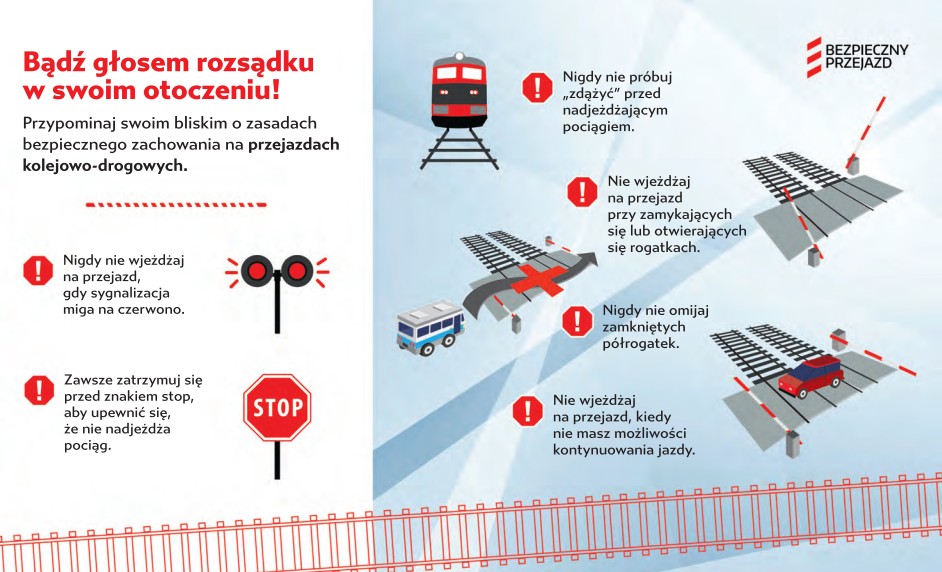 Kampania Bezpieczny Przejazd jest akcją długofalową. Warto sięgnąć po materiały, ulotki, ogólnodostępne statystyki, a nawet specjalne książki i filmy dedykowane również dla młodszych pieszych czy rowerzystów, którzy niejednokrotnie podejmują decyzję o przejściu przez tory mimo uruchomionych czerwonych świateł lub opuszczonych zapór. Paczkę materiałów pobierzecie pod tym linkiem.