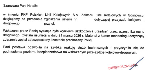 W poniedziałek otrzymałam oficjalne pismo od starszego specjalisty PKP PLK z podziękowaniami za przesłane zgłoszenie. Wyjaśniono również, że wskazana sytuacja była wynikiem uszkodzenia urządzeń przez uczestnika ruchu drogowego. Udzielono mi także informacji na temat zabezpieczenia materiału z kamer monitoringu z dopiskiem, że zostanie on przekazany Policji.