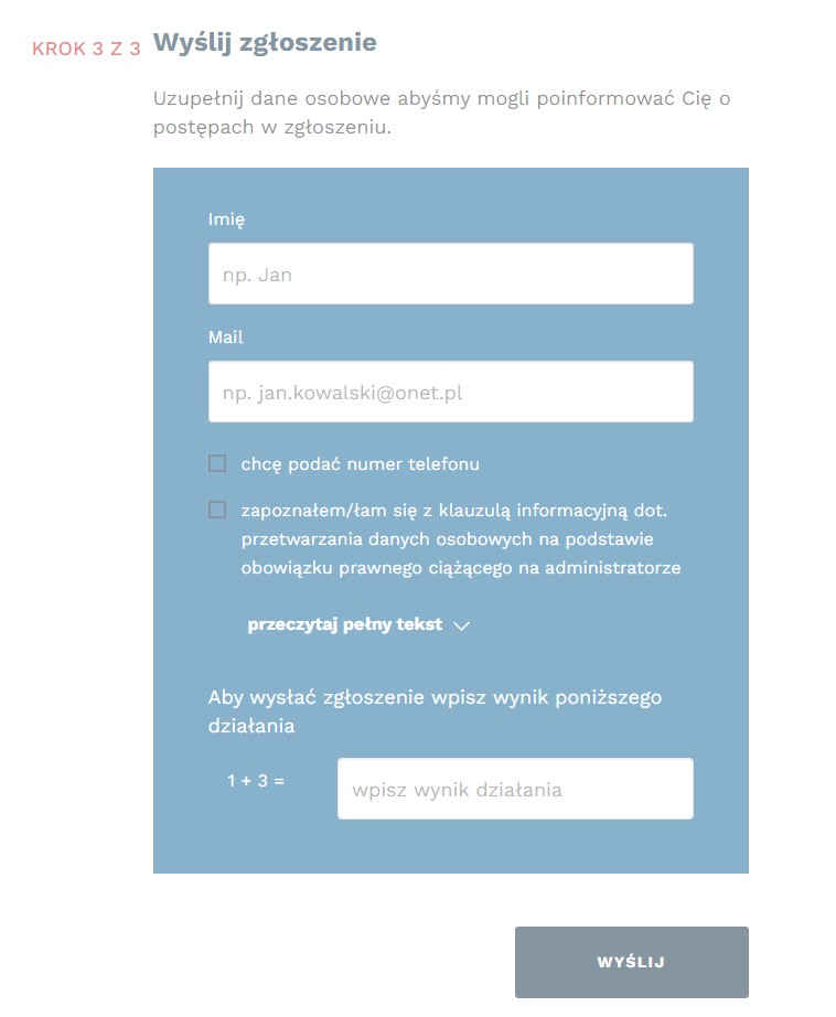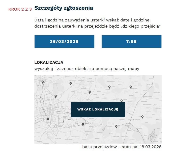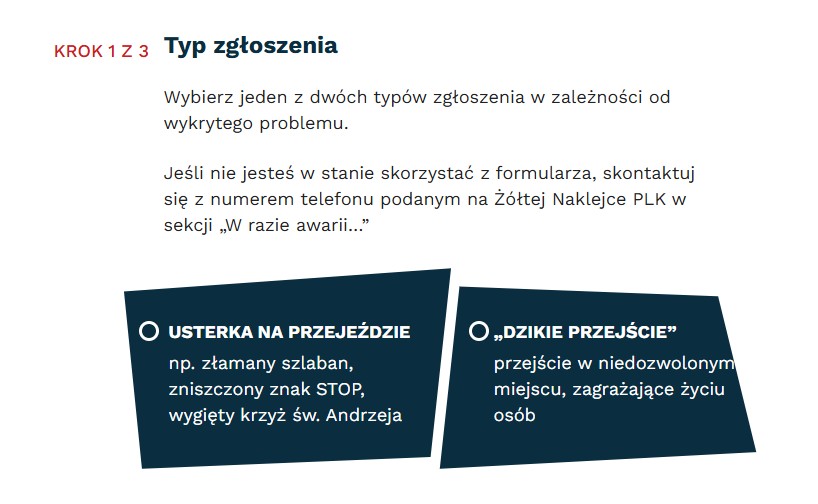 Skorzystałam z formularza zgłoszenia usterki, dostępnego w ramach kampanii Bezpieczny przejazd. Zgłoszenie jest banalne, wystarczy wejść na stronę, wybrać typ zgłoszenia (usterkę na przejeździe lub dzikie przejście), podać lokalizację, datę i godzinę zauważenia usterki oraz krótko ją opisać. W całym zgłoszeniu wystarczy podpisać się imieniem i mailem, można też podać numer telefonu.