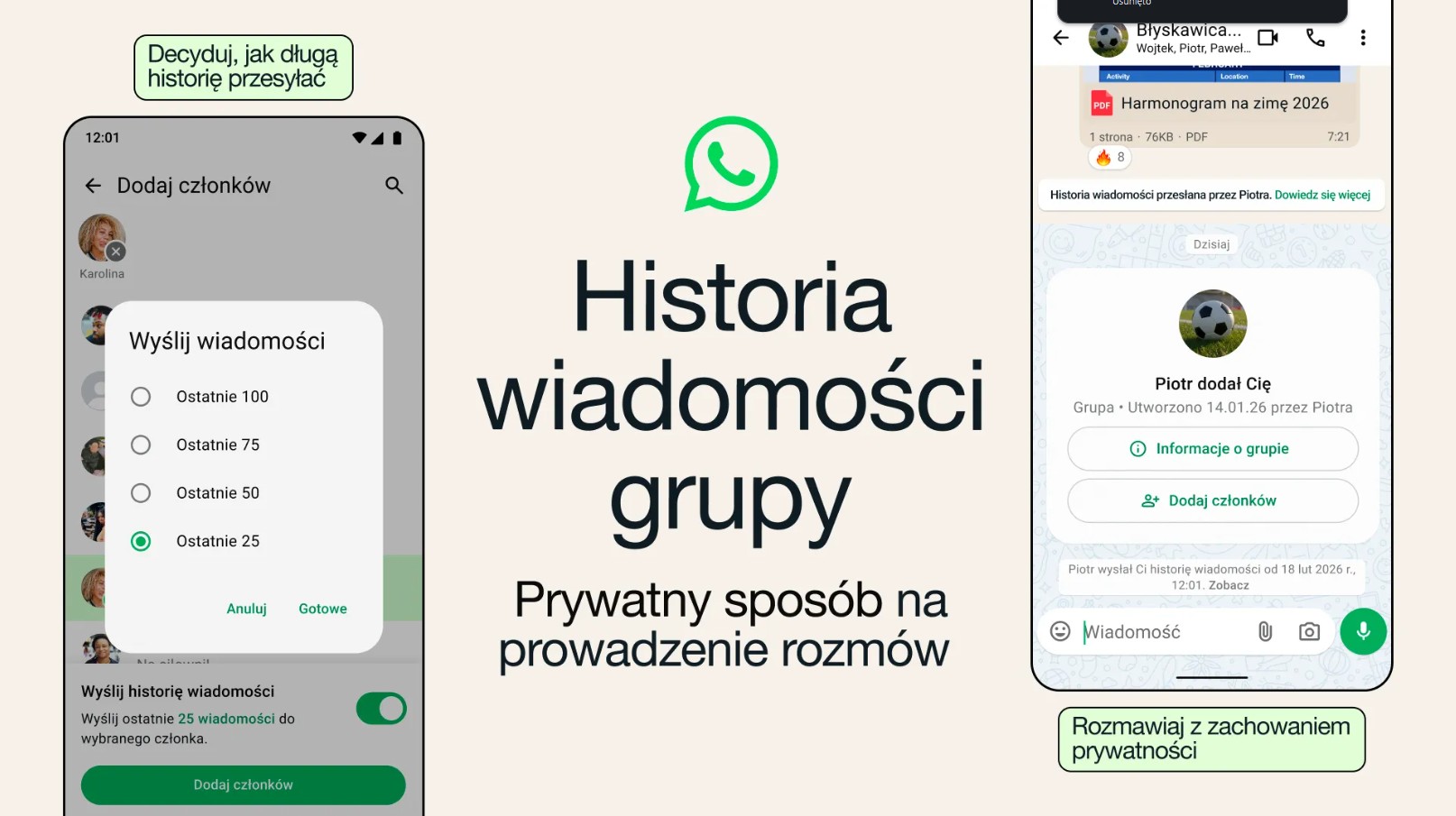 Funkcja Historia wiadomości grupowych umożliwi przesłanie nowemu członkowi grupy ostatnich 25, 50, 75 lub 100 wiadomości. O ich liczbie zdecyduje administrator lub uczestnik grupy, który zdecydował się na przesłanie starszych wiadomości.