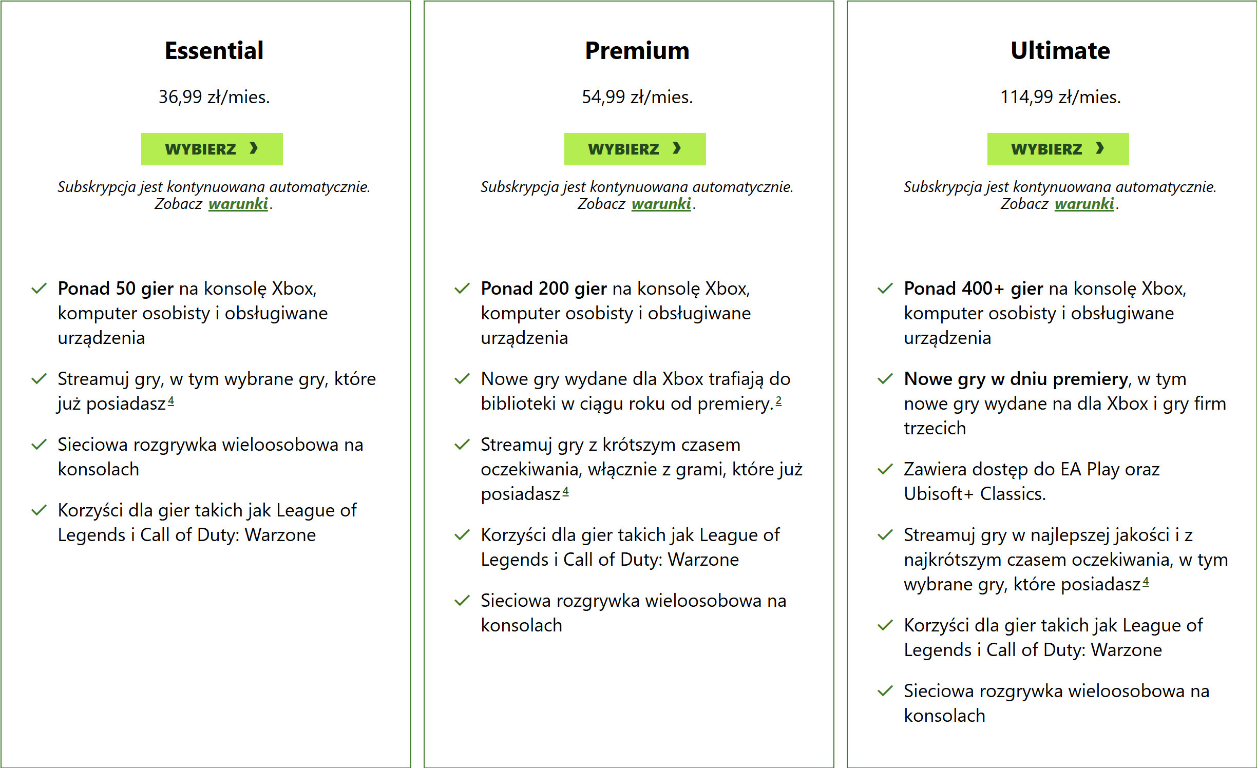 Najbardziej opłacalna opcja nazywa się teraz Essential i oferuje ponad 50 gier na Xboksa, PC i kompatybilne urządzenia. Oprócz tego na miejscu pozostaje opcja dostęp do gry po sieci i korzyści w League of Legends czy Call of Duty: Warzone. Najtańszy pakiet umożliwia również granie w chmurze. Wszystko w cenie 36,99 złotych za miesiąc.