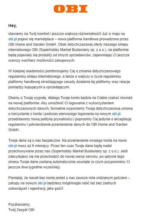 Zgodnie z wiadomością przekazaną w mailu, to użytkownik zdecyduje czy i kiedy zechce skorzystać z nowej odsłony serwisu. Dane na to nowo utworzone konto należy przenieść w ciągu sześciu miesięcy – po upływie tego czasu dane zostaną automatycznie usunięte. Obi poinformuje użytkowników o tym procesie dwa tygodnie przed usunięciem.