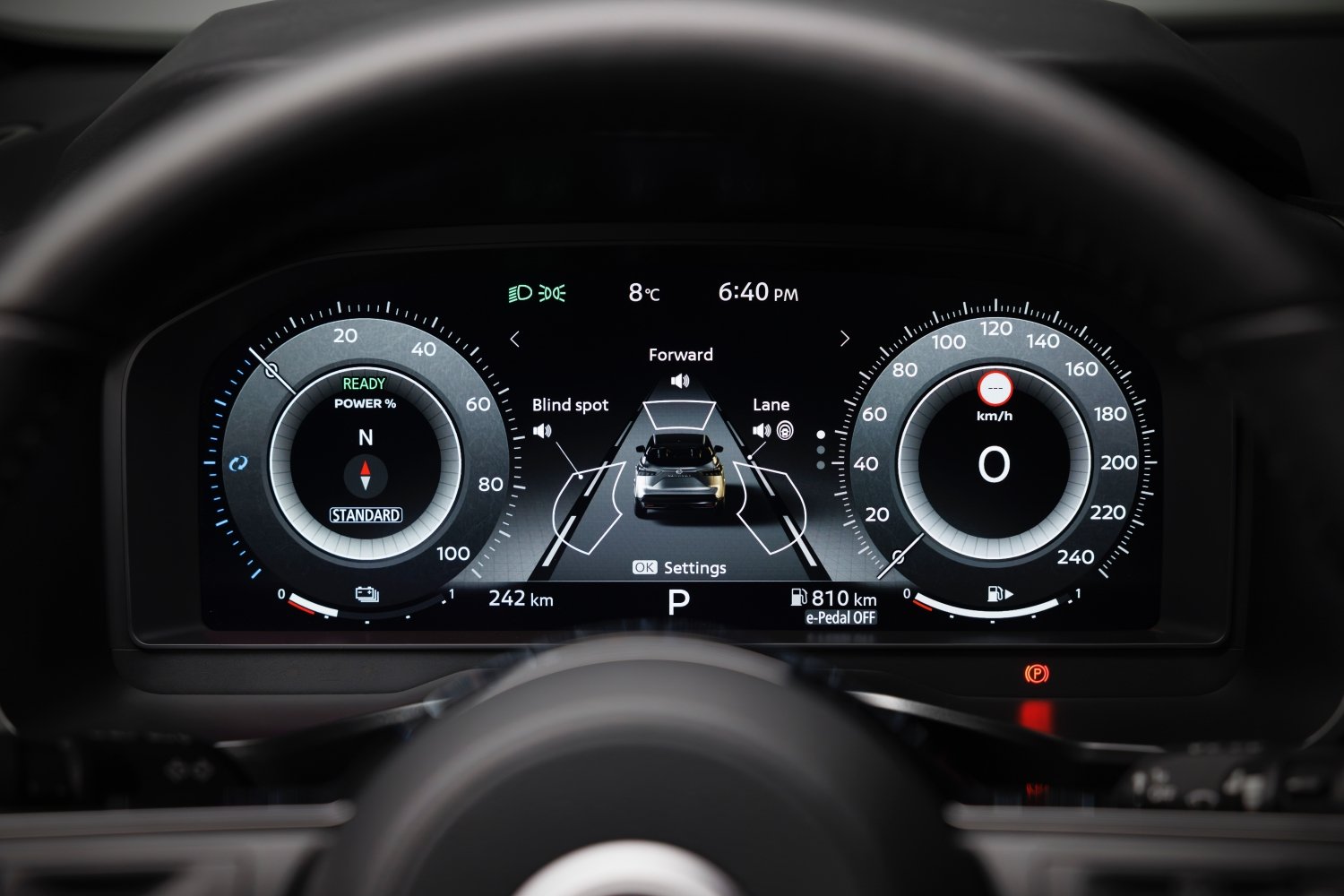 Cyfrowe zegary też doczekały się odświeżenia. Teraz wygląd tarcz na wyświetlaczu zmienia się na czerwony w trybie sportowym, zielony w trybie Eco lub jasnoszary w trybie standardowym – zarówno w normalnym, jak i rozszerzonym widoku. Nissan dodał jeszcze tryb minimalny, który wyświetla tylko podstawowe informacje – wybrany bieg, tryb jazdy i prędkość. W wersjach z napędem e-POWER ekran przepływu energii jest teraz dostępny w trybie widoku normalnego.