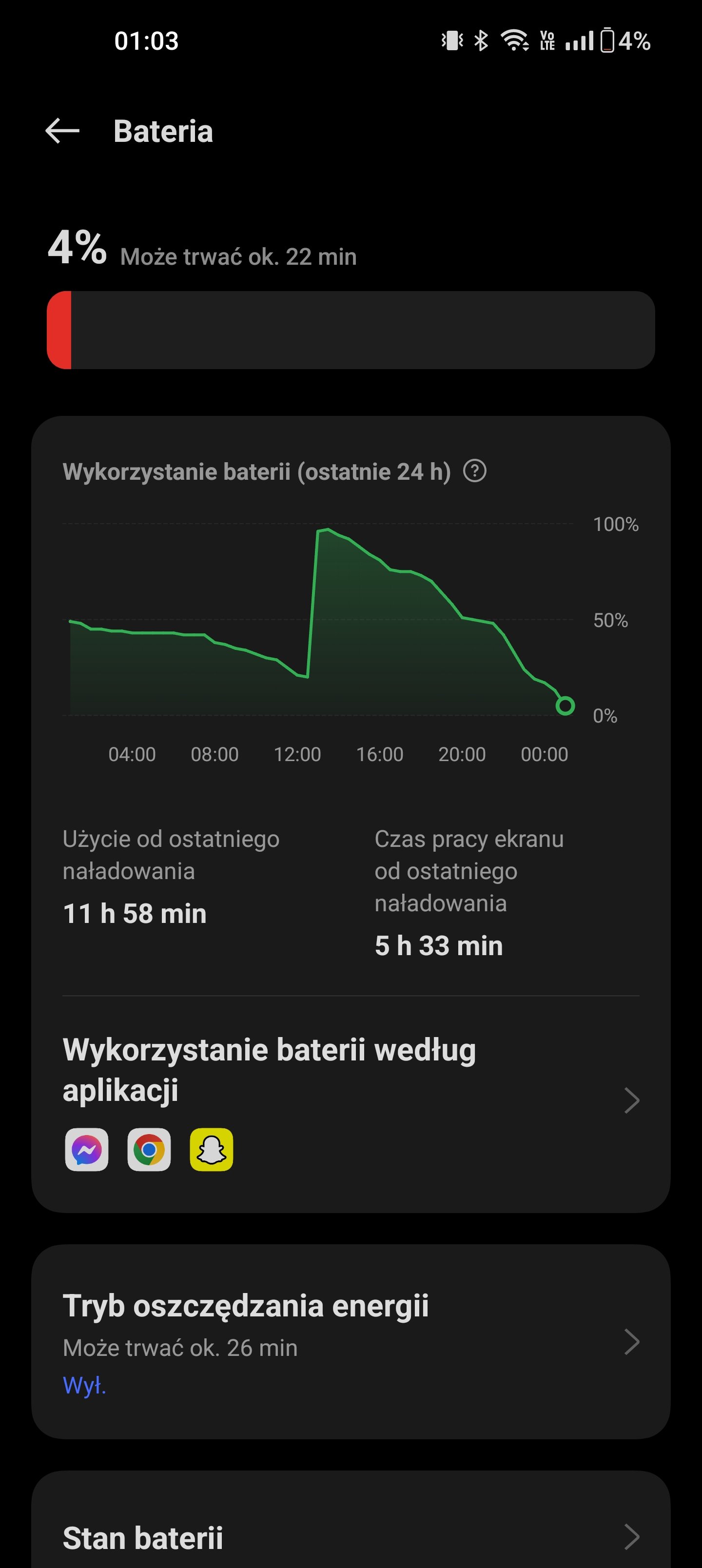 Jeśli chodzi zaś o samo to, jak urządzenie się spisuje na baterii – jest po prostu dobrze. Przez zdecydowaną większość czasu korzystałem ze smartfona z ustawioną maksymalną rozdzielczością, czyli 2K+, i oczywiście odświeżaniem 120 Hz. Gdy więcej przebywałem w domu, a co za tym idzie używałem WiFi, spokojnie uzyskiwałem wyniki od 5 do 6 godzin włączonego ekranu. Najwięcej udało mi się wycisnąć 6,5 godziny.