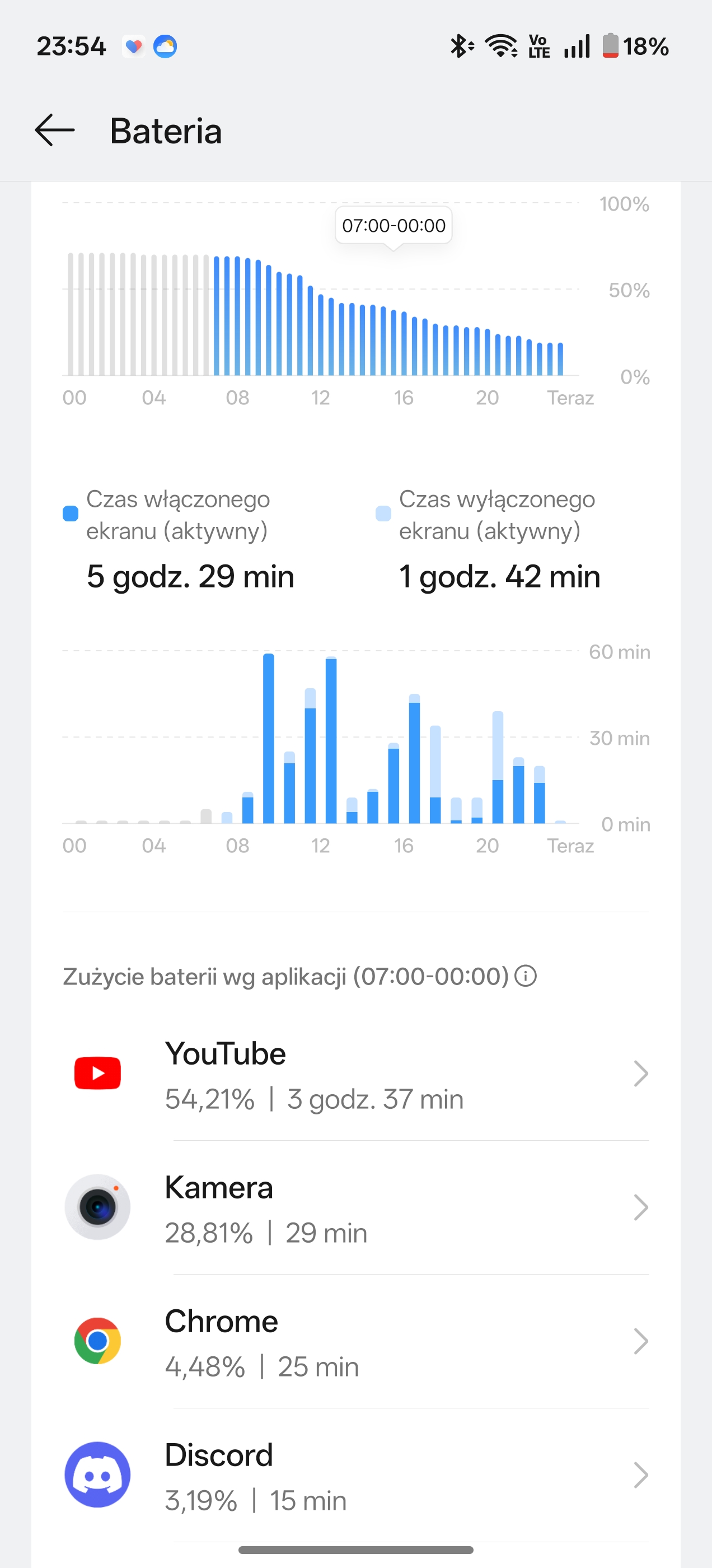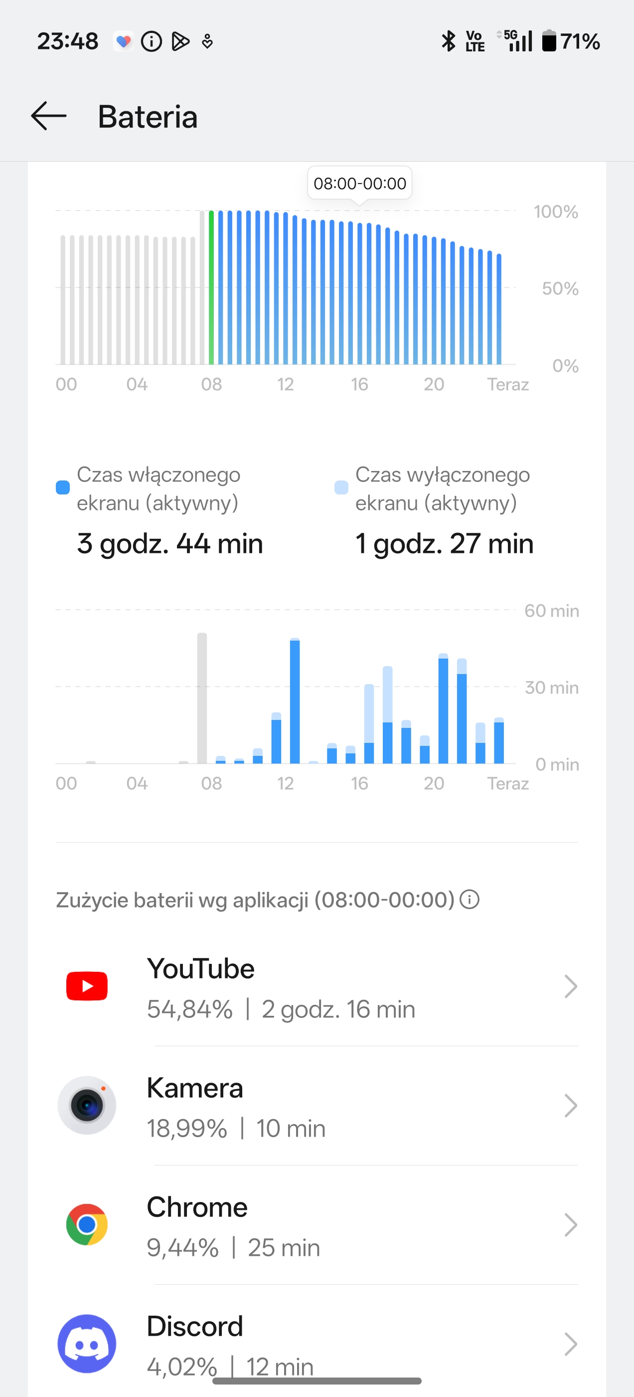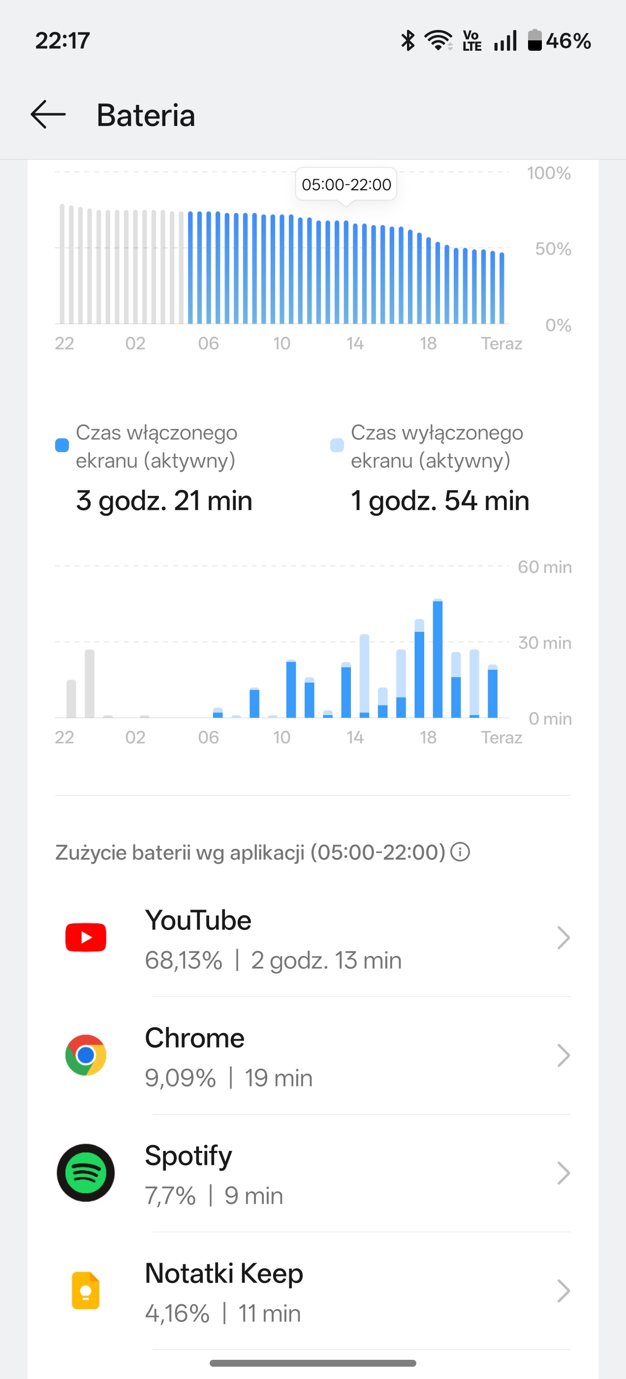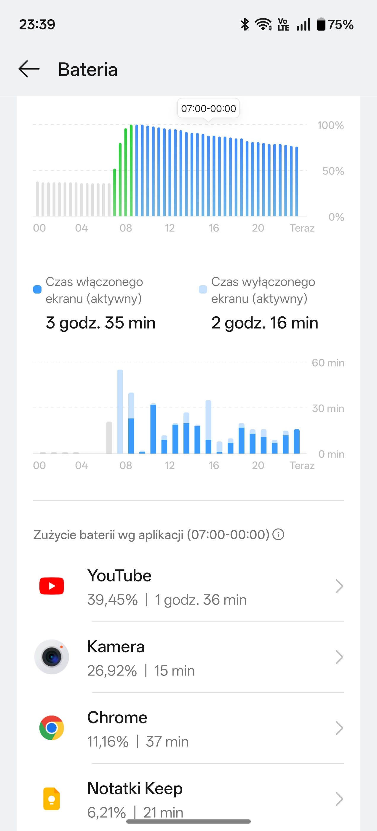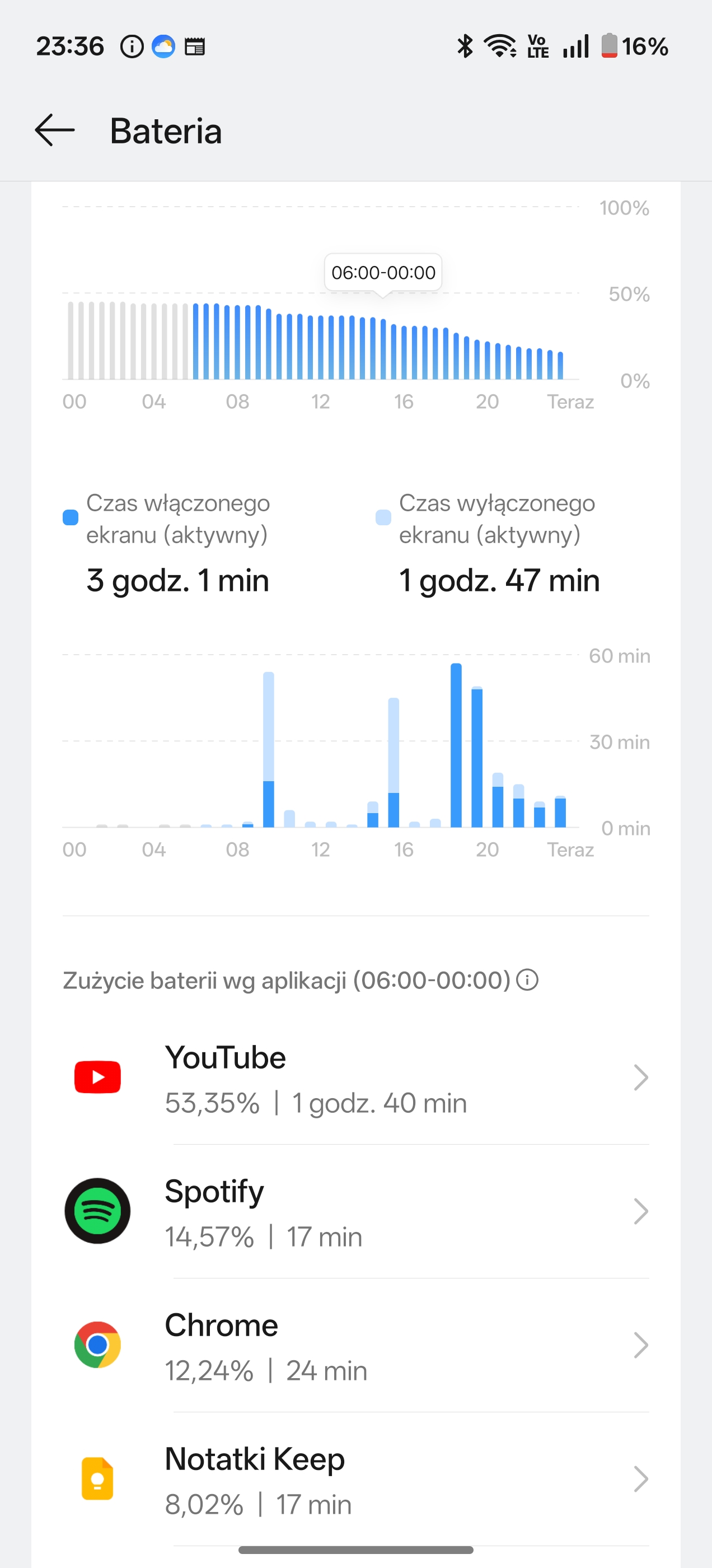 W pierwszym (z typowym dla mnie dziennym SoT nieco powyżej 3 godzin) smartfon OnePlus 15R spokojnie wytrzymał 3 dni. W drugim zaś (bardziej intensywnym – w którym dłużej oglądałem YouTube, sporo korzystałem z aparatu, a do tego jeszcze w użytku była nawigacja) ładowania wymagał po 2 dniach.