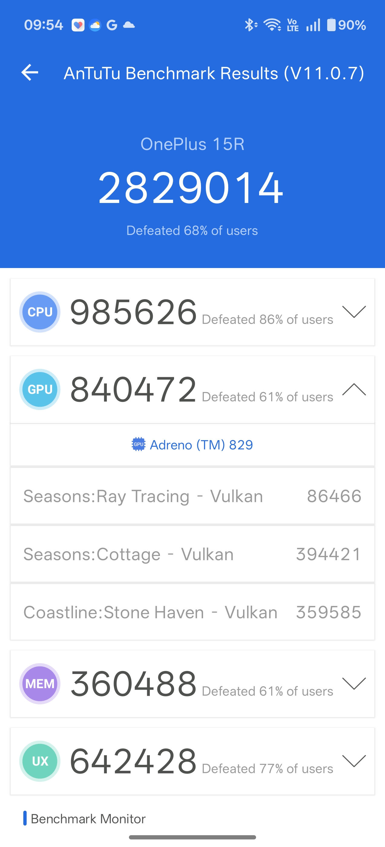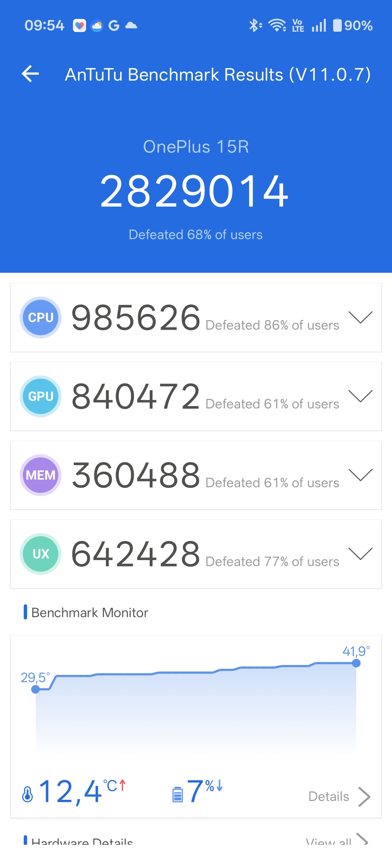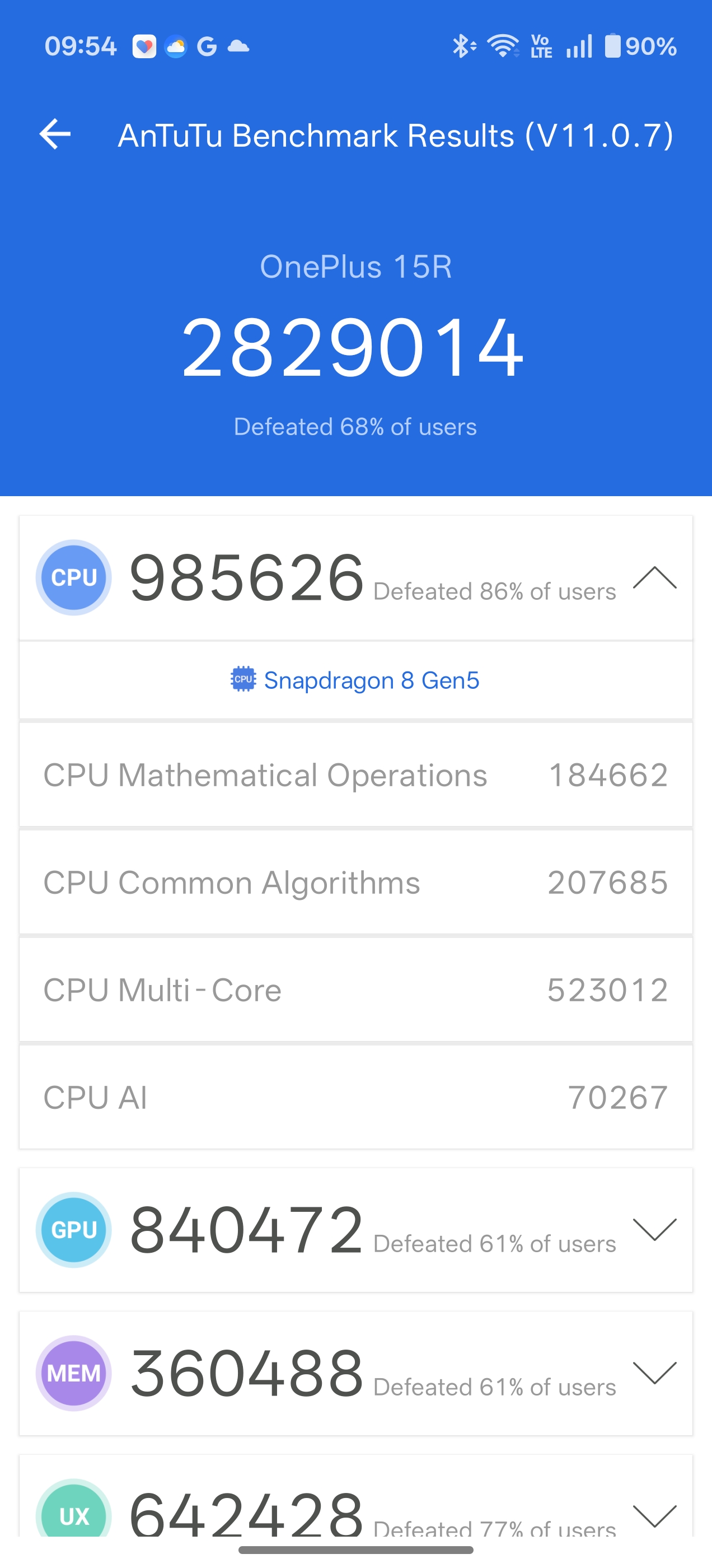 OnePlus 15R to jeden z pierwszych smartfonów wyposażonych w procesor Qualcomm Snapdragon 8 Gen 5, plasujący się tuż poniżej topowego chipsetu amerykańskiego producenta. I cóż mogę powiedzieć – trudno cokolwiek zarzucić modelowi 15R pod względem wydajności – działa bardzo płynnie, właściwie niezależne od obciążenia.