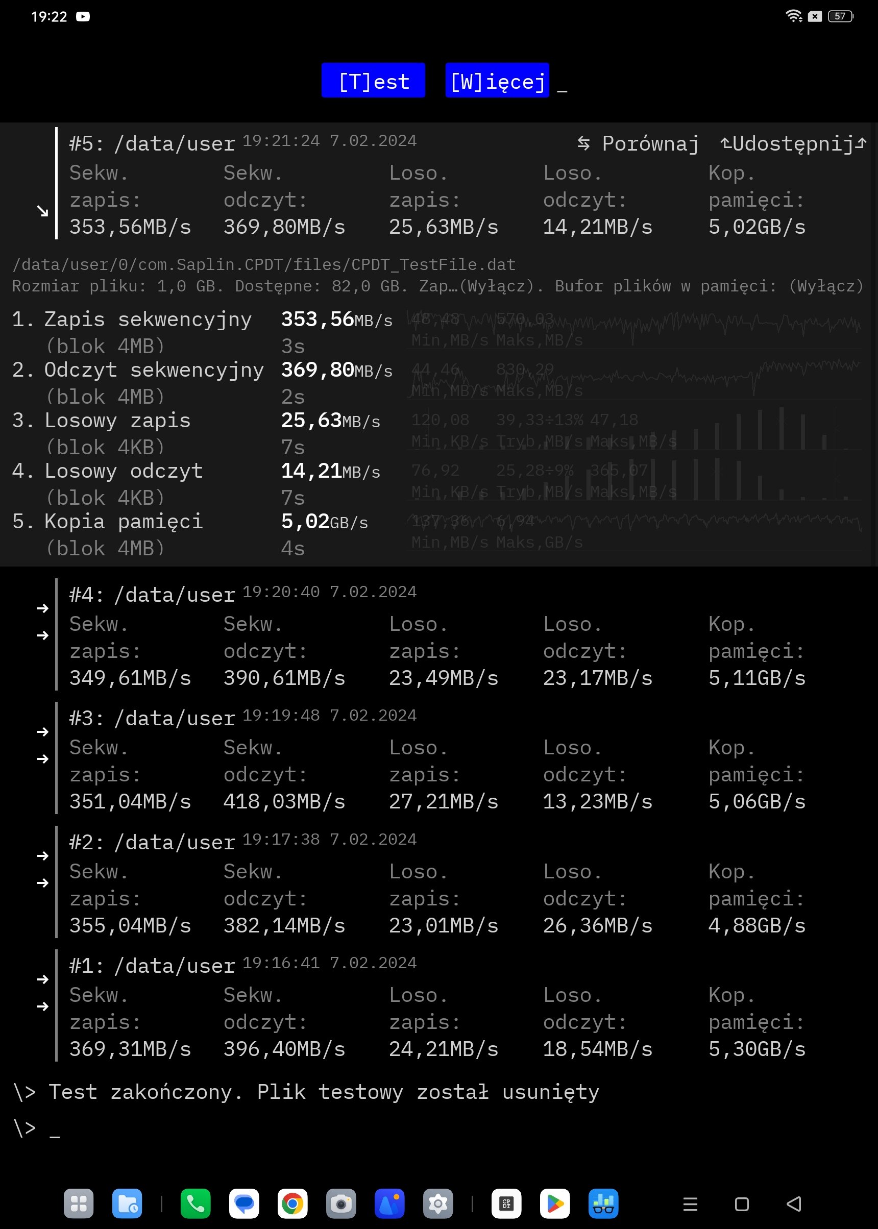 Do przetestowania za pomocą benchmarków została nam jeszcze pamięć wewnętrzna. Oppo Pad Neo oferuje jej dokładnie 128 GB w standardzie UFS 2.2. Pamięć możemy rozszerzyć dzięki karcie microSD. Po pięciokrotnym wykonaniu testów CPDT uśredniłem jego wyniki i wynoszą one: