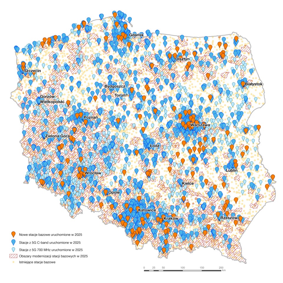 W 2025 roku Orange uruchomiło w Polsce 165 nowych stacji bazowych. Najwięcej nowych nadajników zaczęło działać w województwach dolnośląskim, mazowieckim, śląskim i warmińsko-mazurskim. Wszystkie obsługują technologię LTE, a ponadto 10 z nich nadaje również sygnał 5G w paśmie C (Orange wygrało Blok C, obejmujący zakres 3,6-3,7 GHz) i 700 MHz.
