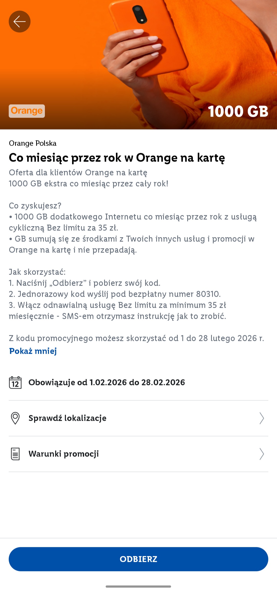 Oferta obowiązuje do 28 lutego 2026 roku, a powyższy benefit dotyczy usługi cyklicznej Orange Bez limitu za minimum 35 złotych. Aby skorzystać z okazji, klient musi najpierw włączyć tę usługę (jeśli nie jest aktywna), a następnie odebrać specjalny kod.
