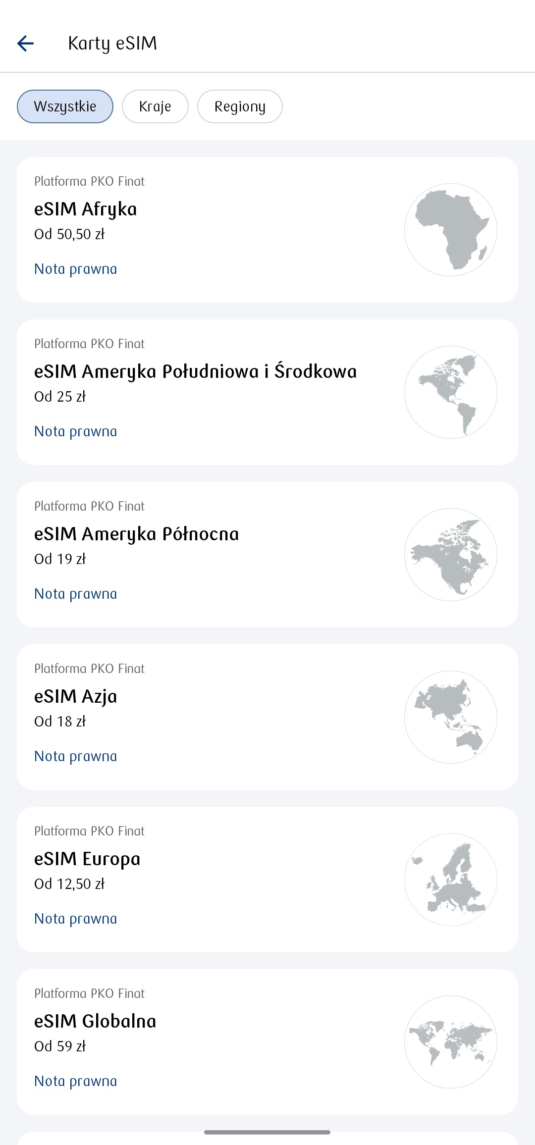 Klienci PKO BP mogą indywidualnie wybierać rozmiar pakietu transmisji danych oraz region lub kraj, do którego podróżują. W ofercie banku znajdziesz pakiety od 1 do 10 GB, a także wariant nielimitowany. Ponadto paczki internetu mogą obejmować cały region np. Europę, Afrykę, Azję i Pacyfik, Amerykę Północną i Południową oraz wersję globalną.
