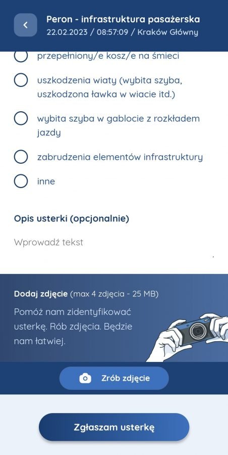 Pod informacjami o lokalizacji oraz czasie zauważenia usterki pojawiają się kafelki, spośród których użytkownik może wybrać, czego dotyczy zgłaszana przez niego nieprawidłowość. Są tutaj opcje: Peron, Windy/schody ruchome, Przejście nad torami/kładka, Przejście przez tory, Przejście pod torami/tunel. Lokalizację można również wprowadzić, korzystając z kodów QR umieszczonych na wszystkich plakatowych rozkładach jazdy. Aby to zrobić, trzeba kliknąć ikonkę symbolizującą kod w prawym górnym rogu.