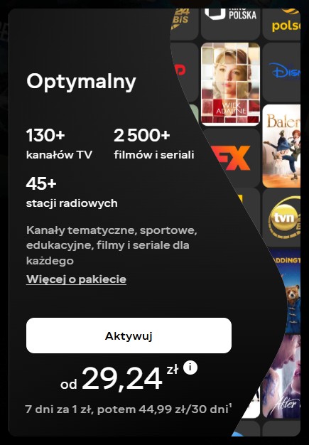 Warto przypomnieć, że standardowa cena tego planu wynosi 44,99 złotych na 30 dni. W ramach pakietu Optymalnego użytkownicy mogą korzystać z ponad 130 kanałów telewizyjnych, ponad 2,5 tysiąca filmów, seriali oraz animacji, a także powyżej 45 stacji radiowych i czterech kanałów Eleven Sports.