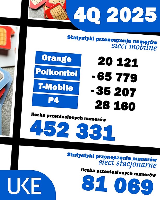 T-Mobile z kolei w czwartym kwartale 2025 roku oddało 106326 numerów i przyjęło 71119, więc ostatecznie straciło 35207 numerów, a w całym 2025 roku oddało 364327 i przyjęło 294886, co oznacza, że przez cały rok straciło 69441 numerów.