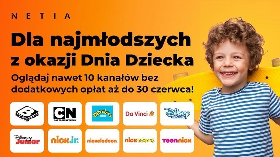 Netia również przygotowała specjalną ofertę z myślą o najmłodszych widzach. Od dziś, tj. 1 czerwca, aż do końca bieżącego miesiąca, czyli 30 czerwca 2022 roku, Netia odkodowała za darmo na dzień dziecka 10 kanałów z treściami dla dzieciaków: Da Vinci (pozycja EPG 39), CBeebies (101), Nick Jr. (102), Boomerang (103), Disney Channel (110), Disney Junior (106), Cartoon Network (112), NickToons (113), Nickelodeon Polska (114) i TeenNick (117).