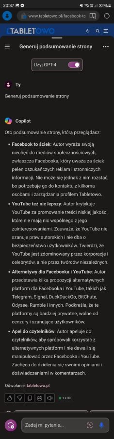Być może pamiętacie poirytowanie Grześka na reklamy, które zaczęły mu się nagminnie wyświetlać na Facebooku. Był nimi na tyle rozczarowany, że popełnił na ich temat bardzo fajny felieton. Edge podsumował go całkiem nieźle, ale z użyciem GPT-4 już mocno poleciał – w tekście nie ma nic na temat wymienionych przez asystenta aplikacji (skąd to zatem wziął? nie wiem). W tym przypadku przeglądarka Samsunga poradziła sobie chyba najlepiej – wyciągając z materiału jego esencję.