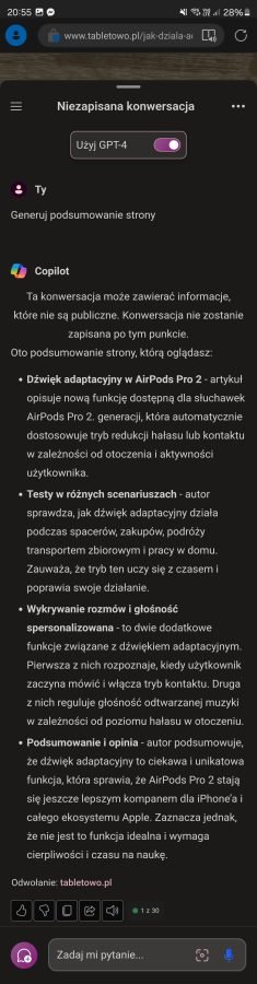 Zacznijmy jednak od podstaw. Podsumowywanie tekstów w przeglądarce Samsunga dostępne jest w dwóch opcjach – domyślnie stosowane jest standardowe (krótkie, treściwe, często wybrakowane) lub szczegółowe (rzeczywiście – jest bardziej rozwinięte). W przypadku Microsoft Edge mamy do czynienia z jedną opcją, którą długością można porównać ze szczegółową opcją z Samsunga (no dobra, właściwie to z dwoma, licząc możliwość przełączenia się na ChatGPT 4). Pytanie który mechanizm działa szybciej i jest bardziej dokładny.